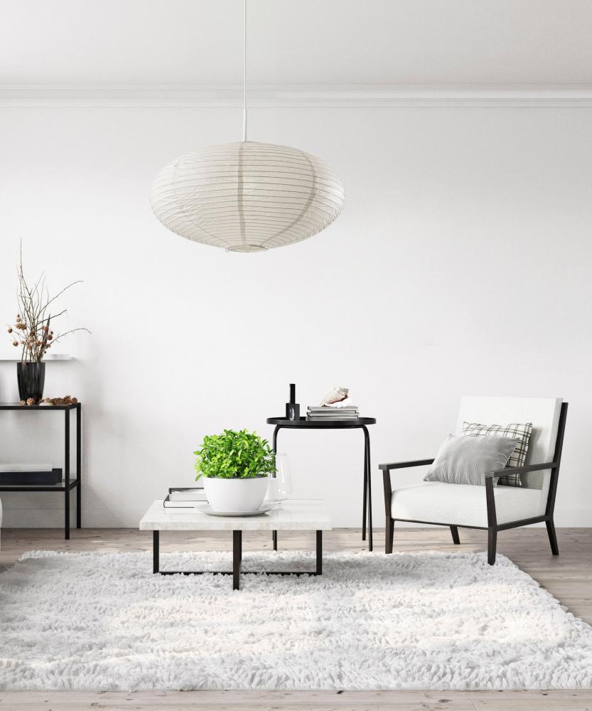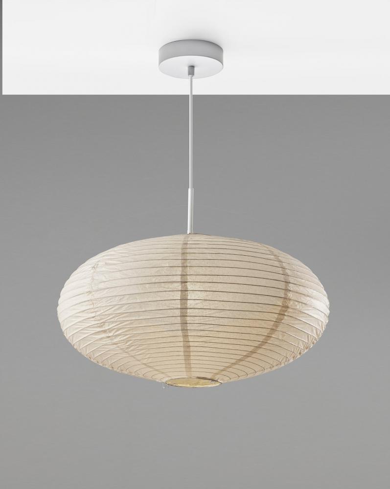 The Alana large pendant light adds a modern spin to the traditional paper lantern design. With a monochrome look, the pendant features a round white canopy base supporting an off-white paper shade measuring 13.25" tall and 24" in diameter. The shade softly distills the light from a 100W bulb for an even, warm glow. Hang the pendant by itself or pair it with several more to create a stunning effect and add illumination to your kitchen, dining area, bedroom, or bathroom. With a 5? white cord, the height of the light can be adjusted to suit the needs of any room regardless of the ceiling height. The Alana pendant light is also available in a smaller, 11" tall and 20" diameter option.