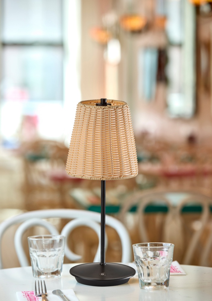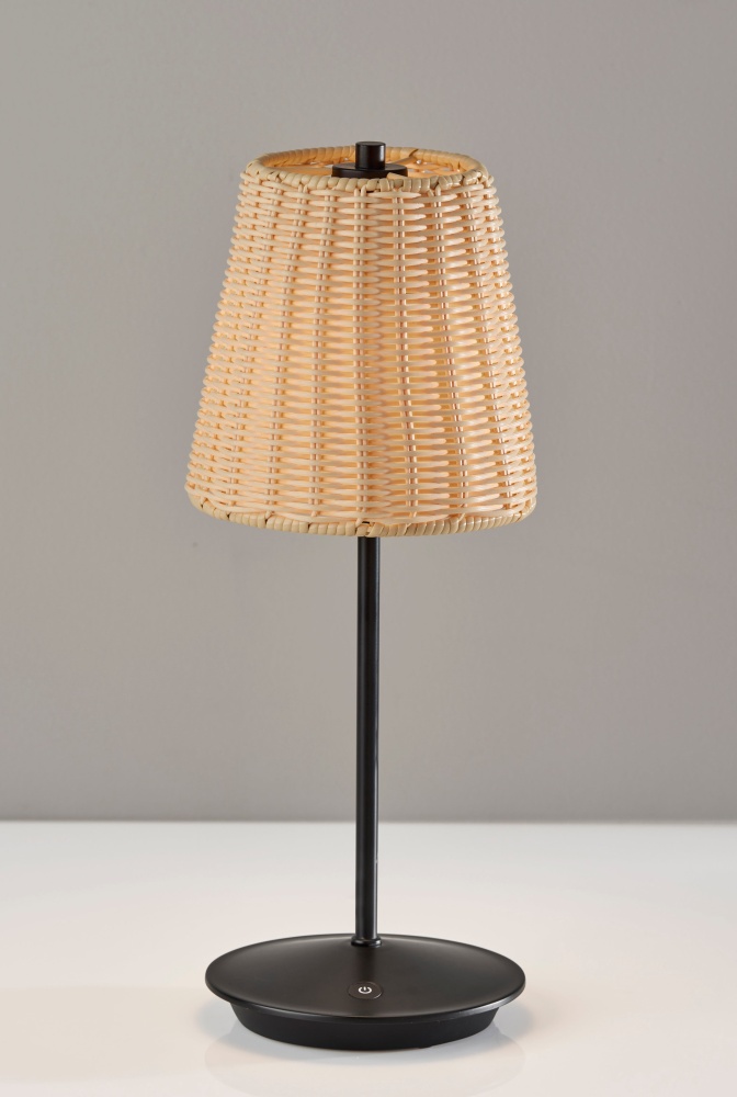 Introducing the 4074-01 Andy Cordless LED Table Lamp, a versatile lighting solution designed to enhance both indoor and outdoor spaces with its sleek design and practical features. With a contemporary black finish and a stylish plastic rattan shade, this lamp effortlessly complements any decor style. Standing at 15 inches tall, it's the perfect size for bedside tables, patio settings, or outdoor gatherings. The lamp features a convenient 3 Level Touch Dimmer Switch, allowing you to adjust the brightness to suit your needs and set the desired ambiance. Powered by a rechargeable 1.5W LED, this lamp offers portability and flexibility, making it ideal for use anywhere you need it. Plus, with an IPX4 location rating for outdoor use, you can enjoy reliable performance even in outdoor environments.