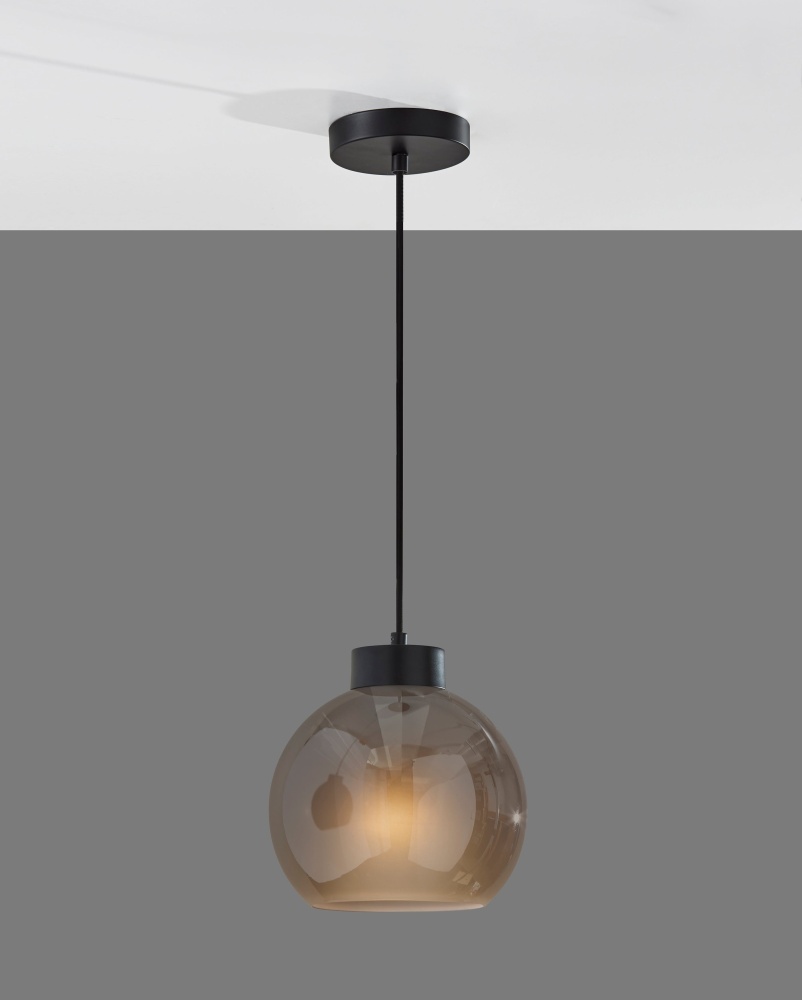 Introducing the 3896-01 Atticus Pendant, a stylish and versatile lighting solution that adds a touch of sophistication to any space. Featuring a sleek black finish and a 9-inch diameter globe-shaped smoked glass shade, this pendant light exudes modern elegance. The glossy exterior of the shade contrasts beautifully with the frosted interior, creating a captivating lighting effect that enhances the ambiance of your room. Complete with a black fabric-covered cord and hardwire compatibility, the Atticus Pendant offers effortless installation and seamless integration into your home decor.