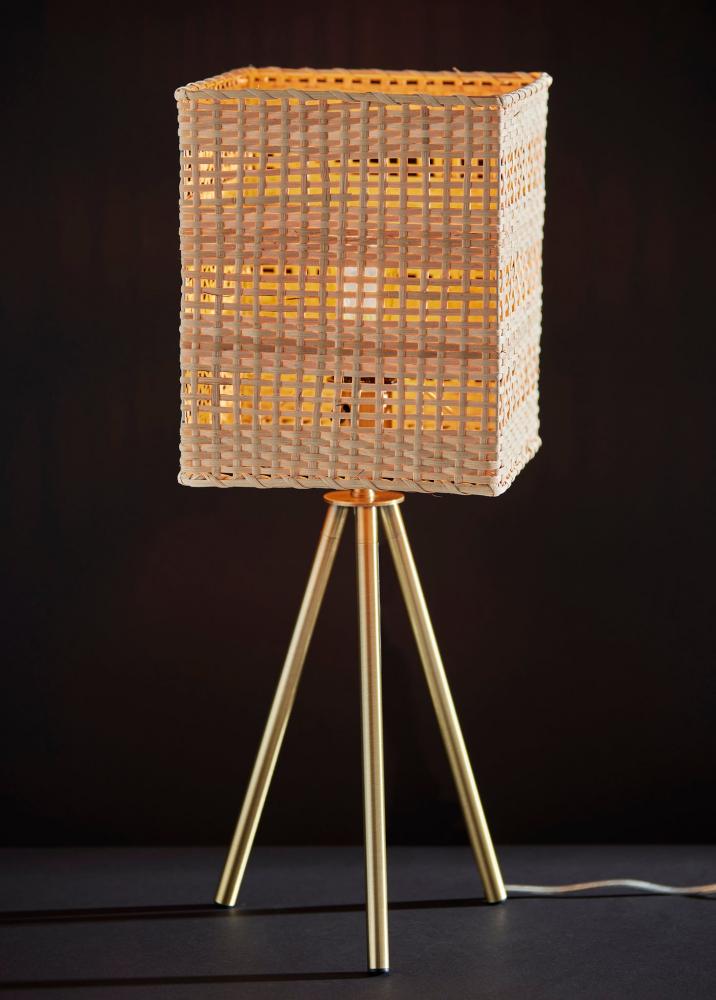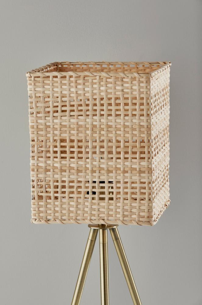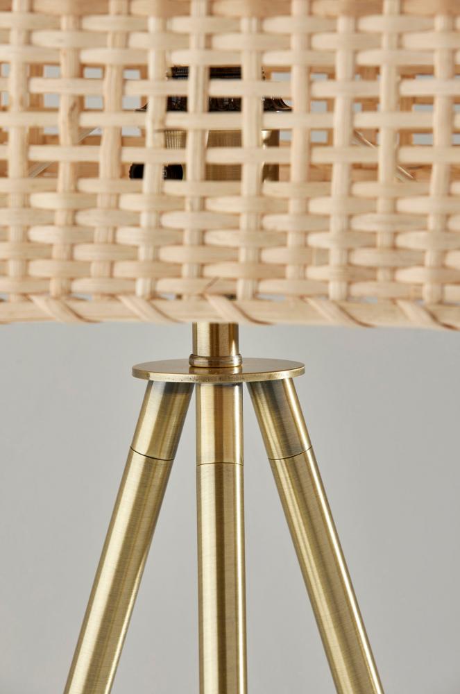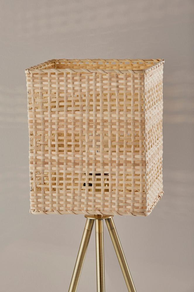 The strong coastal design elements and contemporary silhouette of the Bondi table lamp bring effortless style to living rooms, offices, bedrooms, and more. The clean lines of three legs with an antique brass finish form a tripod design for a 9" footprint. This base supports a large rectangular light rattan shade with heavy texturing for a stunning look that gently disperses the light from a 60W bulb. The lamp is easily turned on and off with a rotary socket switch. Complete your décor with the coordinating Bondi floor lamp and pendant light.