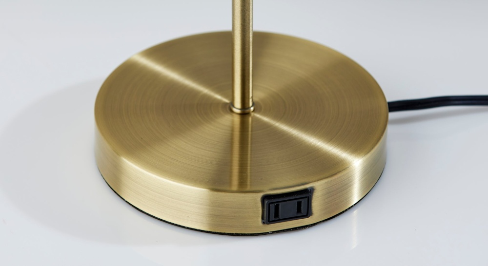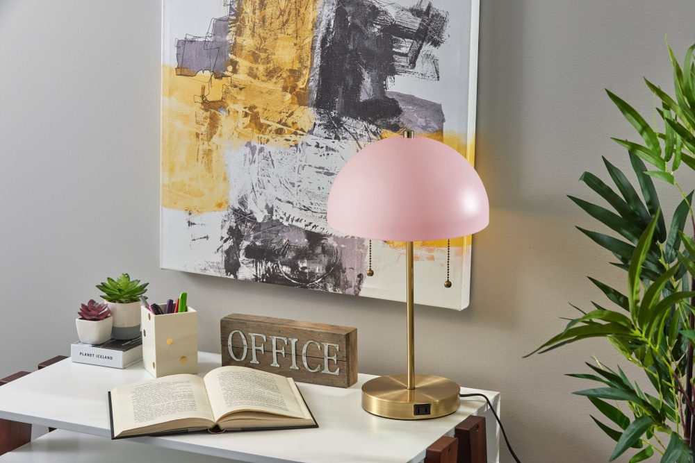 The 18 tall Bowie table lamp shines a light on vintage-inspired design in a mix of antique brass and pale pink finishes. With its geometric symmetry and art deco flair, it is the perfect statement piece for desks, side tables, or nightstands. It features a pop of color with a sleek metal dome shade in matte, pale pink finish that curves like a canopy over the lamp's slender pedestal and round base, both featuring an antique brass finish. For convenient access to power right from your desk or table, the 6.5 diameter base features an AC outlet. Whether the lamp is turned on or off, the AC outlet will keep working normally. Operated by dual pull chains in antique brass finish to easily turn it on or off, the lamp powers two 40W bulbs (not included) and features a 5' clear cord. The Bowie table lamp is also available with a black, white, or pale blue finish on the shade.