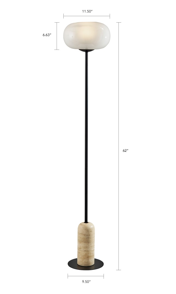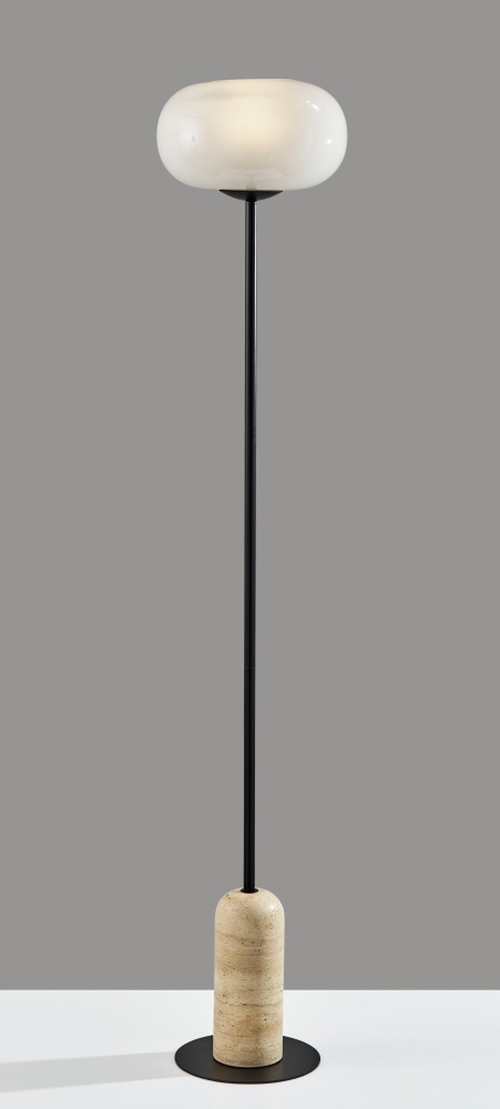 Introducing the 3149-01 Byron Floor Lamp, a stunning blend of contemporary design and natural elements that adds sophistication to any room. Featuring a sleek black finish and a white glass shade, glossy on the outside and frosted on the inside, this lamp creates a warm and inviting glow. The chunky travertine stone base adds a rustic, organic texture, perfectly complementing the modern design. Equipped with an easy-to-use on/off foot step switch, the Byron Floor Lamp provides both style and convenience, making it a versatile lighting solution for any space.
