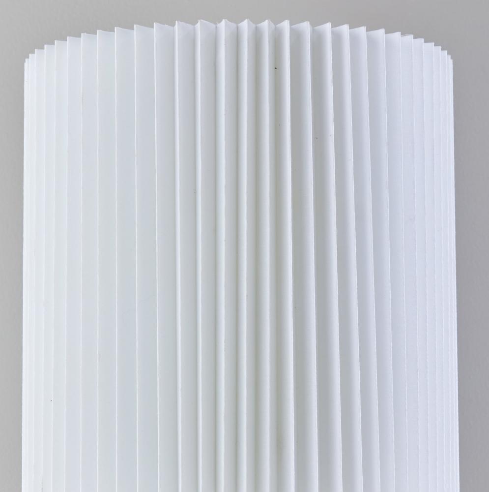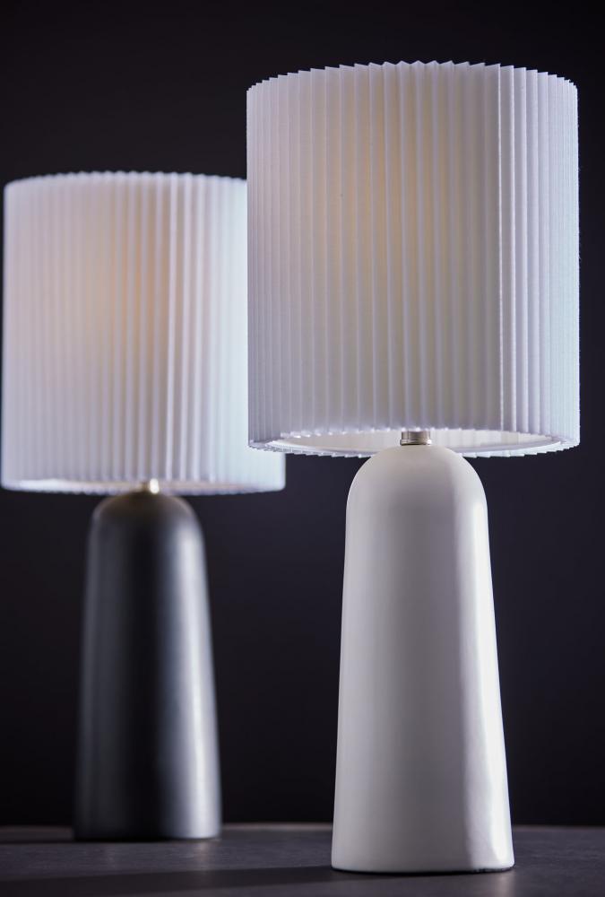 Less is more! With a casual and elegant design, the 26" tall Callie table lamp complements elegant, Scandinavian décor. The 6" diameter dome base features clean lines and white ceramic construction while the white pleated fabric drum shade adds an elegant design touch. Operated by a rotary socket switch to easily turn the 100W bulb on or off, the table lamp is also powered by a 5' clear cord. For a variety of style options, the Callie table lamp is also available with a black or beige ceramic base.
