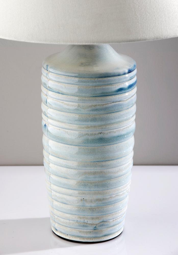 Coastal Elegance: The 1639-07 Catalina Table Lamp features a light blue ribbed ceramic base that captures the serene beauty of coastal landscapes, creating a tranquil atmosphere.