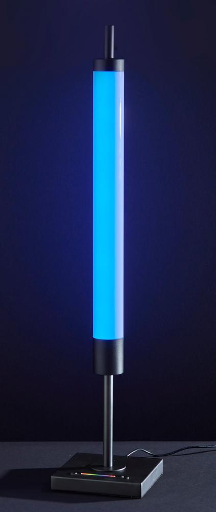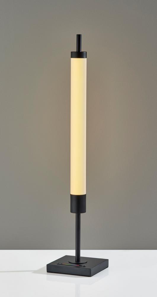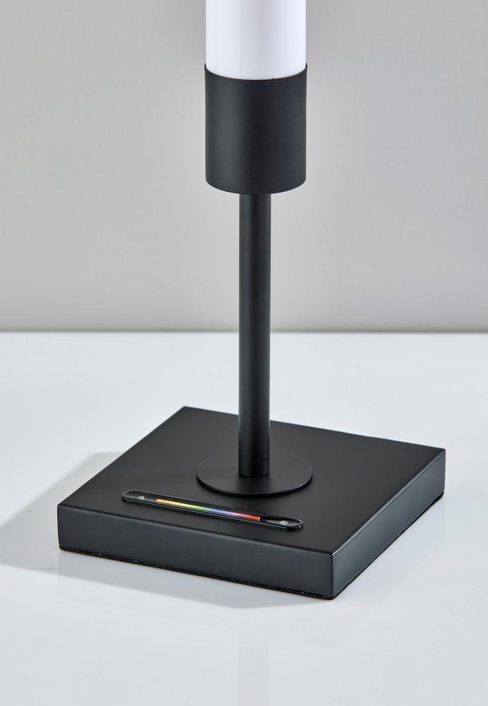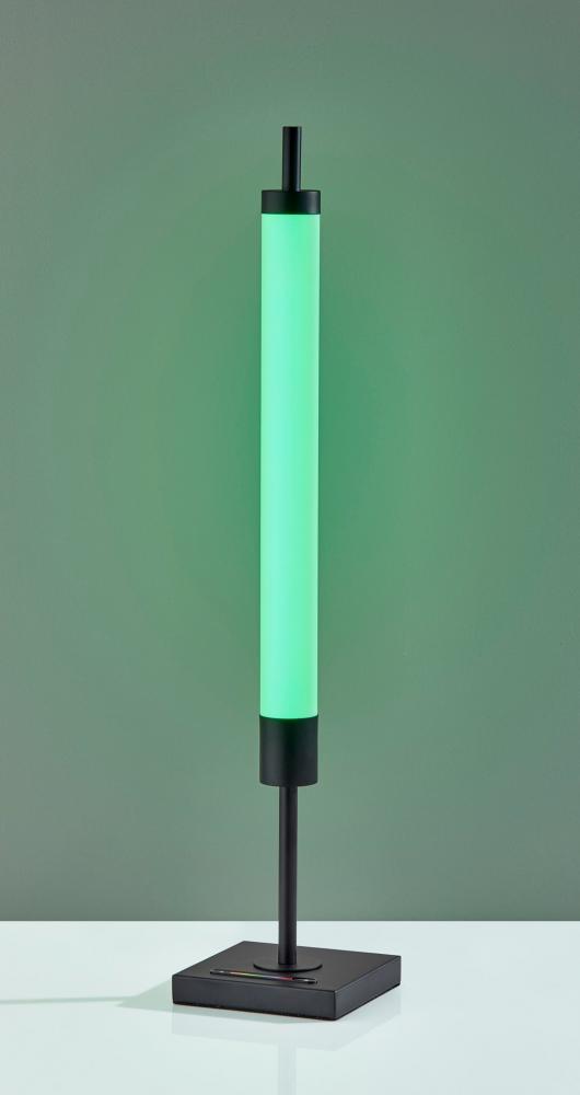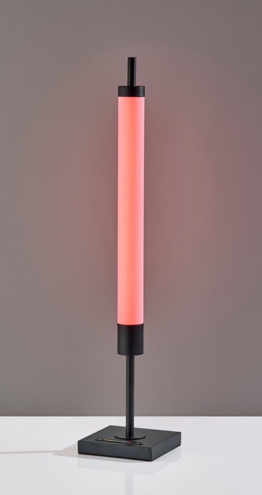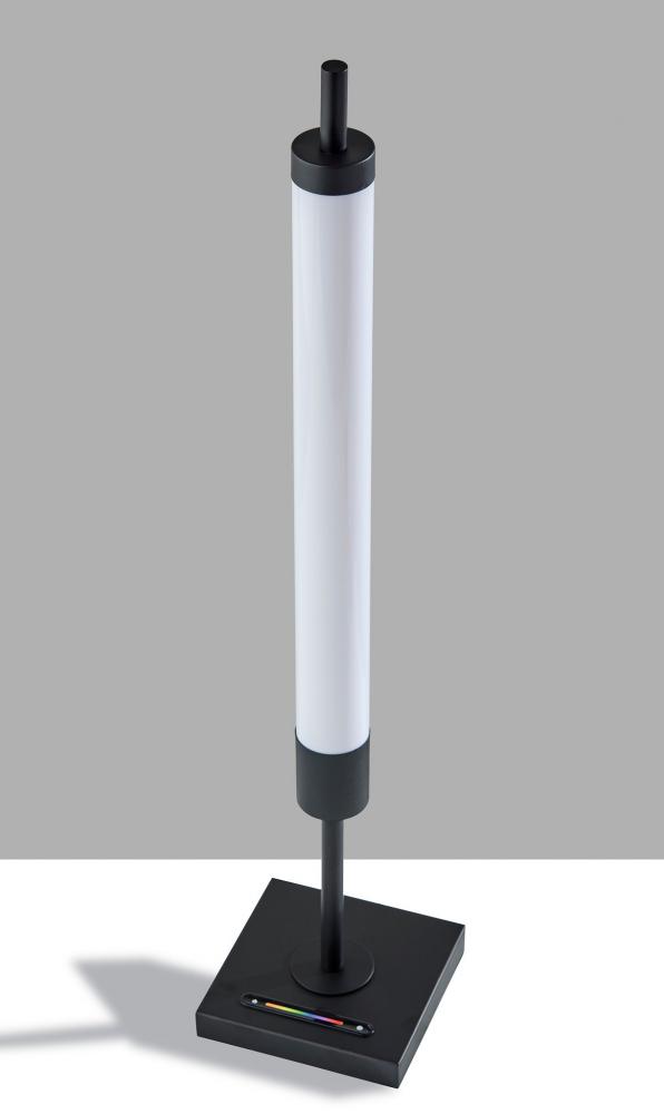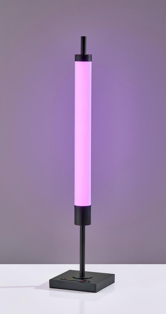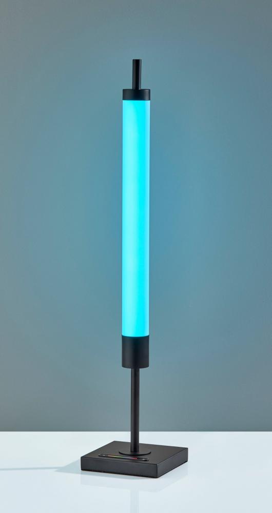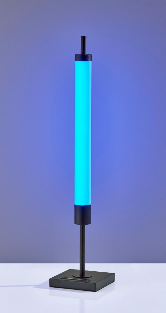 For a modern, minimalist design that adds vibrant ambient lighting, look no further than the Collin LED color changing table lamp. The lamp provides a minimalist silhouette, rising from a 6" square black metal base to a 17" tall slender cylindrical shade measuring 2" in diameter. Its size is ideal on nightstands where it can act as a nightlight or on end tables or desks for greater illumination. Both economical and versatile, the integrated 12W eco-friendly LED produces up to 1,000 lumens to brighten your space. Operated by a touch switch conveniently located on the base, the shade projects light in a full spectrum of RGB color and features three brightness settings all controlled by the touch of a finger. The lamp is also powered by a 5' black cord. Complete your décor with the Collin LED color changing floor lamp and 3 light floor lamp.