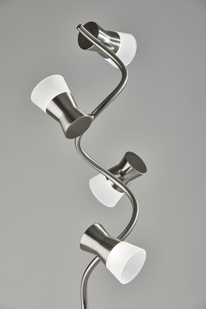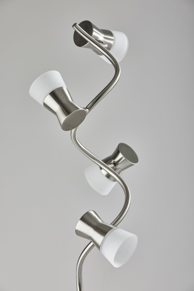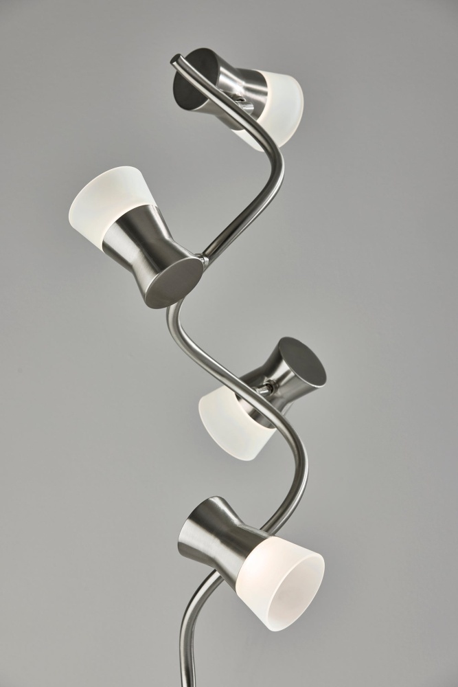 Excelling at both accent lighting and brightening an entire room, the Cyrus floor lamp's gracefully twisting silhouette blends style and function. Crafted with a brushed steel finish, the thin, twisting pole supports four LED light fixtures at offset heights and angles, bringing 800 lumens of energy-efficient 12W LED lighting. The LED lighting is integrated into the lamp and softened by frosted glass shades. Anchoring the lamp is a 10" diameter round base in brushed steel finish leading to a matching pole. With a smart switch located on the pole, you can control a full-range dimmer and five settings to find the perfect color temperature for your mood, from crisp to warm, at the touch of a finger. The lamp is powered by a 5' black cord. Complete your decor with the coordinating Cyrus LED table lamp.
