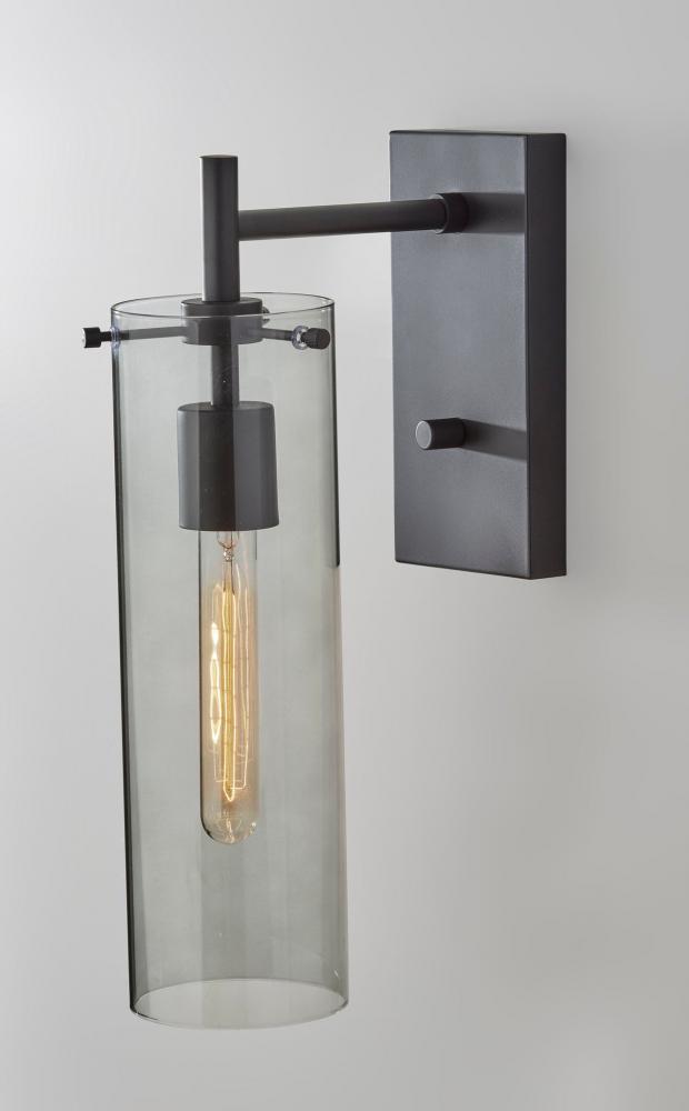 With clean, simple lines, a black metal finish, and vintage Edison bulb, the Dalton wall lamp integrates seamlessly with industrial and modern chic styling. For symmetrical design, pair two of these sconces on either side of beds, fireplaces, or mirrors or place individually in entryways or other spaces for a pop of light. The lamp mounts to your wall with an 8.75" x 4.75" rectangular wall plate crafted of black metal, while a matching arm extends to support the lightshade. Suspended from the arm is a luxuriously styled smoked glass cylindrical shade that leaves the included 40W Edison tube bulb visible for striking, vintage appeal. The lamp is easily operated by a discreet rotary switch located on the wall plate. Complete your décor with the Dalton 1-light floor lamp, 2-light floor lamp, desk lamp, and pendant light.