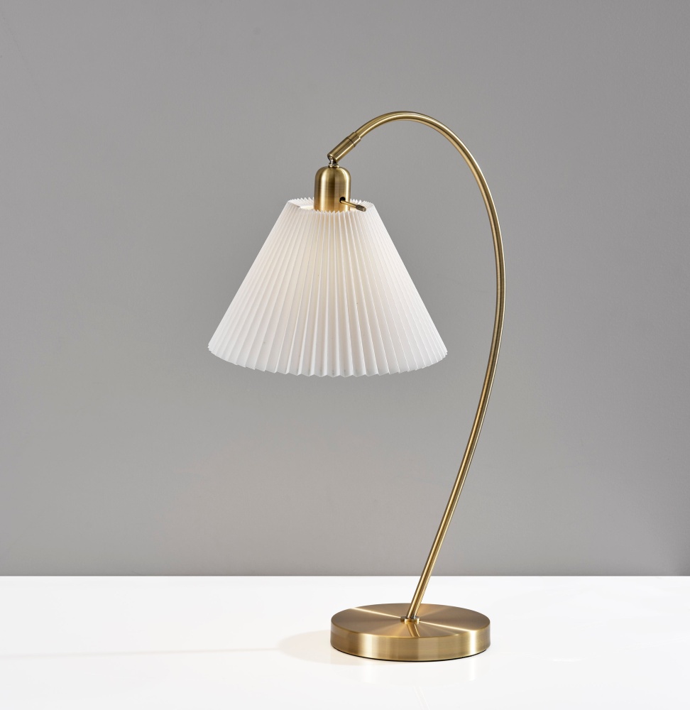 Illuminate your space with the timeless elegance of the 4350-21 Delaney Table Lamp. Featuring an antique brass base, this lamp exudes sophistication and adds a touch of vintage charm to any room. The off-white KD pleated fabric tapered shade softly diffuses light, creating a warm and inviting ambiance. Standing at 25.875 inches tall, the Delaney Table Lamp is the perfect addition to desks, bedside tables, or living room accent tables. Its on/off rotary socket switch ensures easy and convenient operation. Whether placed in the living room, bedroom, or office, the Delaney Table Lamp effortlessly enhances your decor with its classic design and practical functionality.