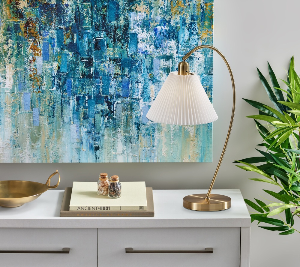 Off-white KD pleated fabric tapered shade softly diffuses light for a warm ambiance.
