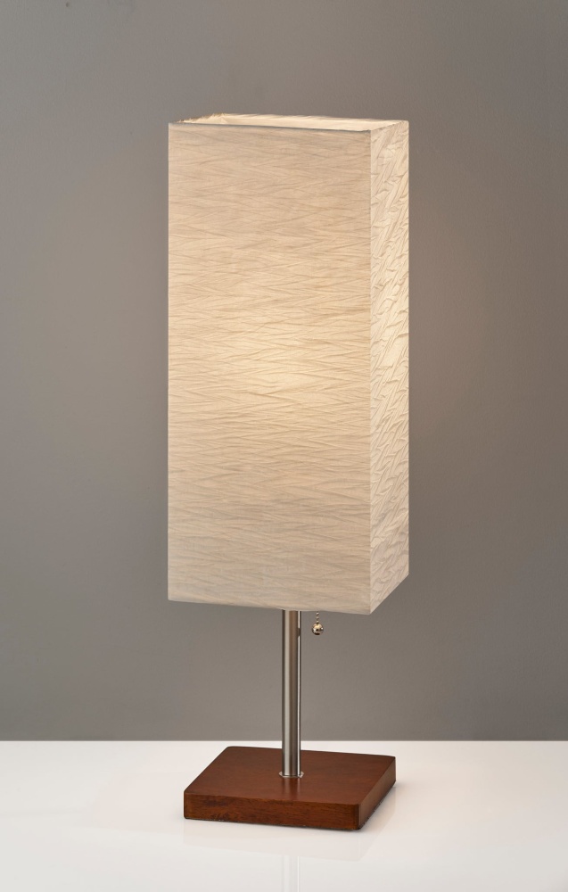 The Dune table lamp adds an accent of nature as well as illumination to any room. The walnut wood base with satin steel accents contrasts with the texture of the collapsible white crinkle paper shade. The on/off pull-chain switch reinforces the theme with a wooden ball accent. This lamp has a clear cord and is smart outlet compatible. Bulb is not included.