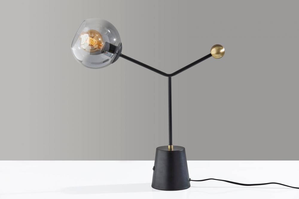 Introducing the 2155-01 Dusk Table Lamp, a captivating and stylish lighting solution that adds a touch of contemporary charm to your space. This table lamp features a sleek black finish that complements its chunky tapered metal base, exuding modern sophistication. The focal point of this lamp is its fading smoked glass globe-shaped shade, which creates a mesmerizing and alluring lighting effect. With a height of 23.25 inches and a reach of 20 inches, the Dusk Table Lamp is a versatile addition to your decor.