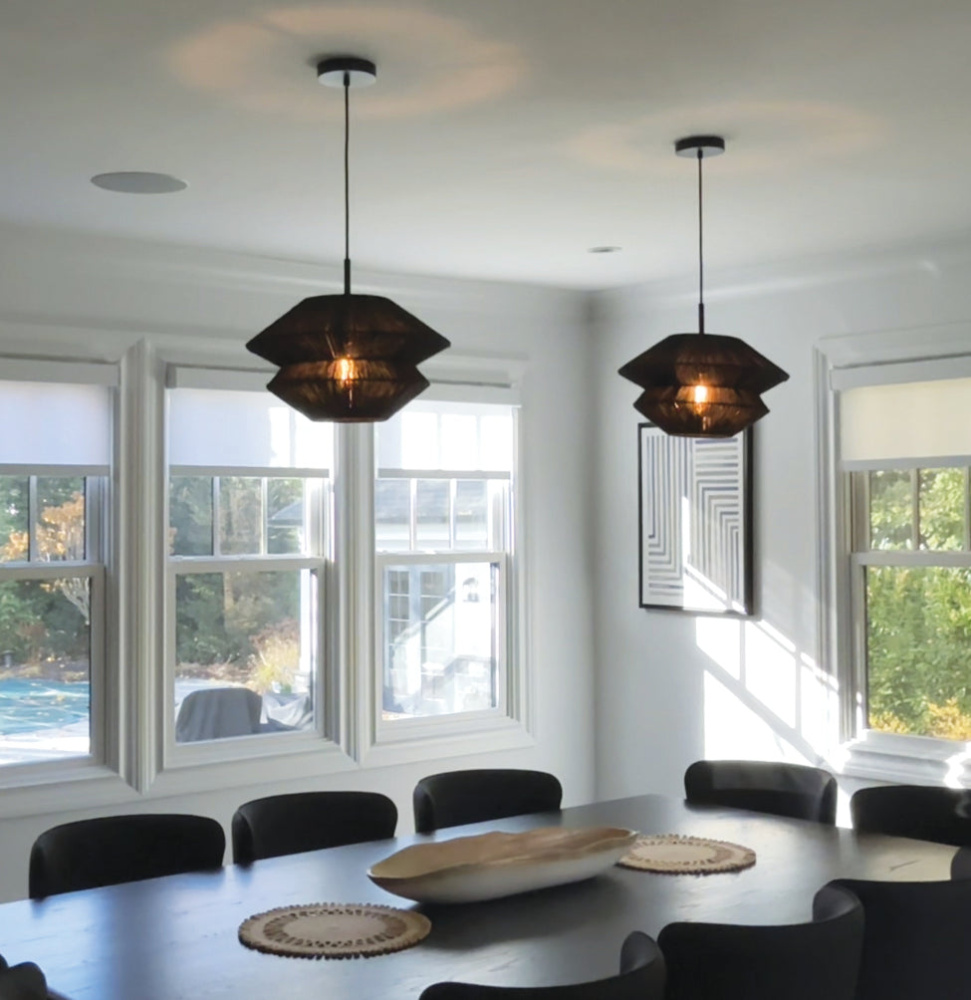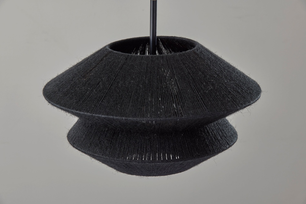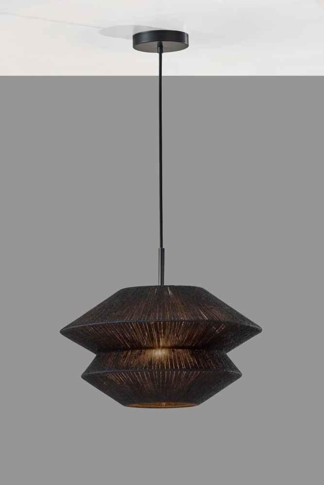 Modern aesthetic: Sleek black finish and origami-shaped black rope shade create a contemporary look.