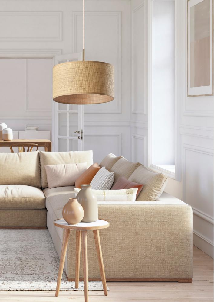 The antique brass finish of the base, white cord, and beige trim offer a neutral color palette.