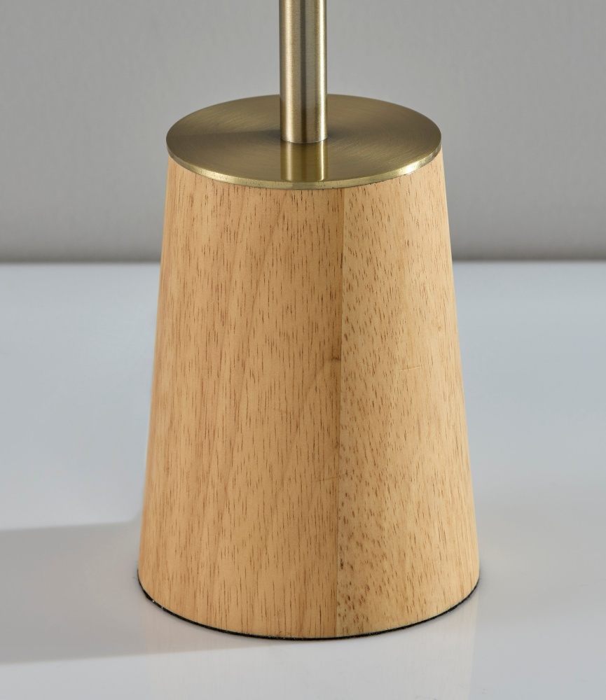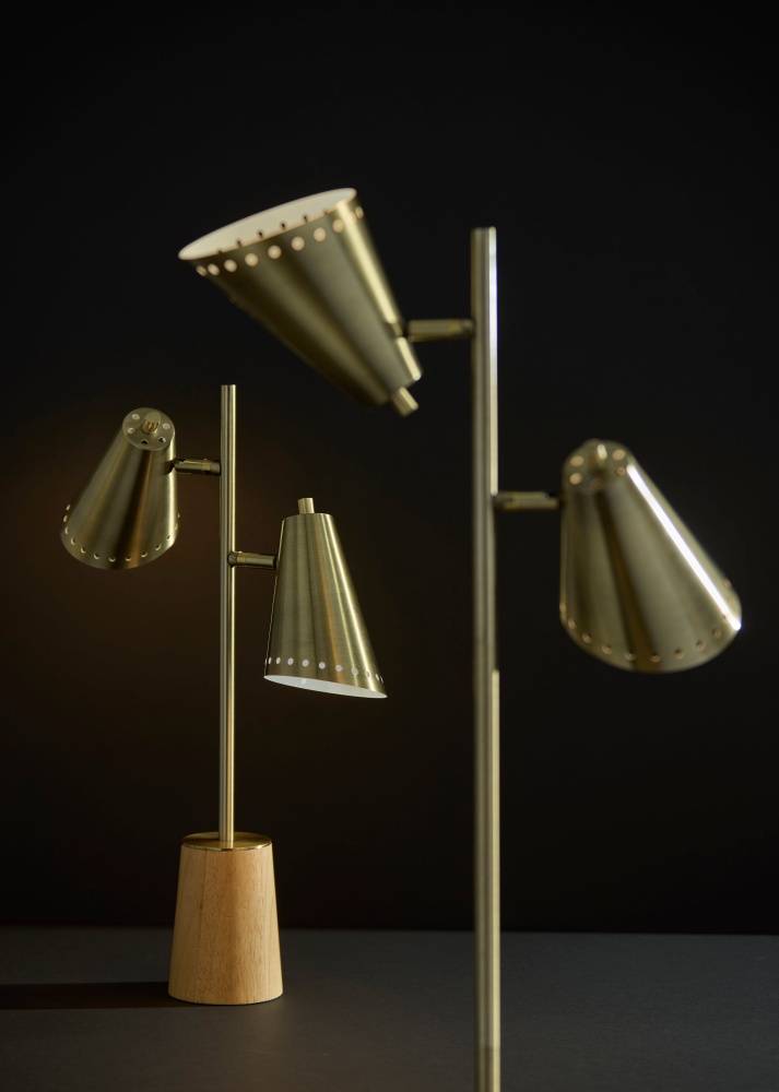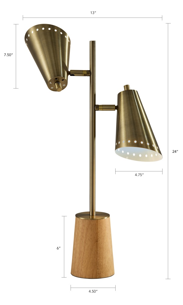 Introducing the 9410-21 Josephine Desk Lamp, a perfect combination of vintage charm and modern functionality. With its antique brass finish and two adjustable cone-shaped brass metal shades, this lamp brings both elegance and versatility to your workspace or bedside table. Standing at 24 inches tall, it features a chunky natural wood base for added stability and a touch of organic warmth. Each shade is equipped with a 40W on/off rotary socket switch, allowing you to customize your lighting needs with ease.