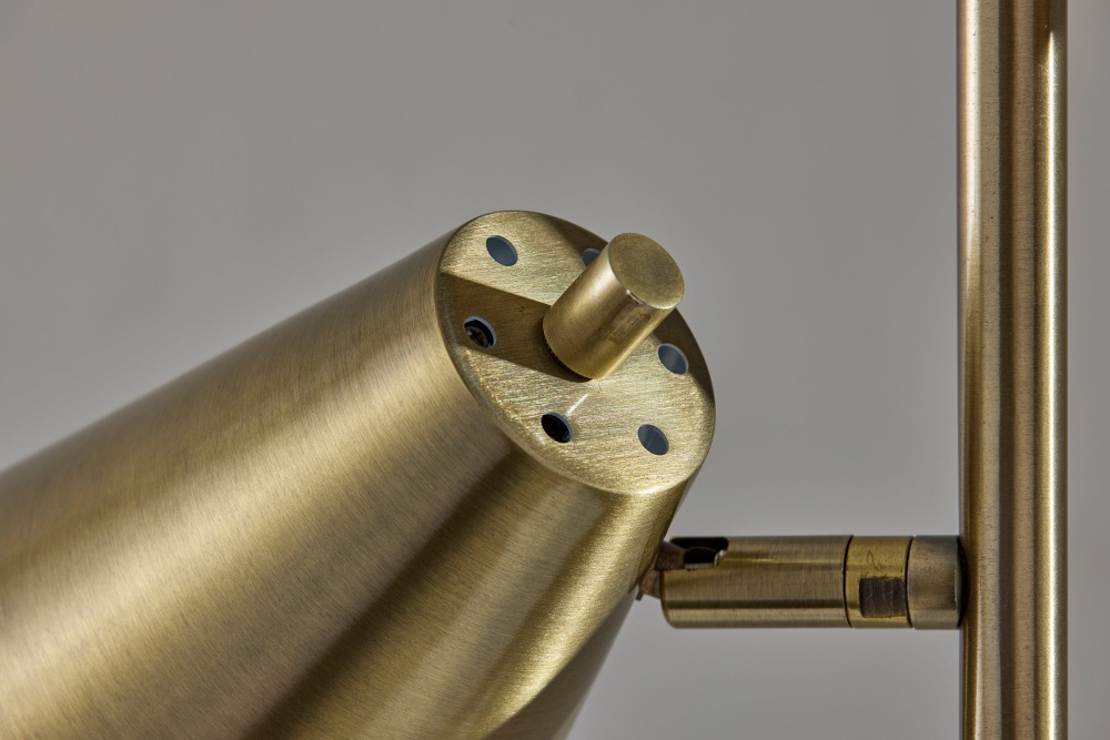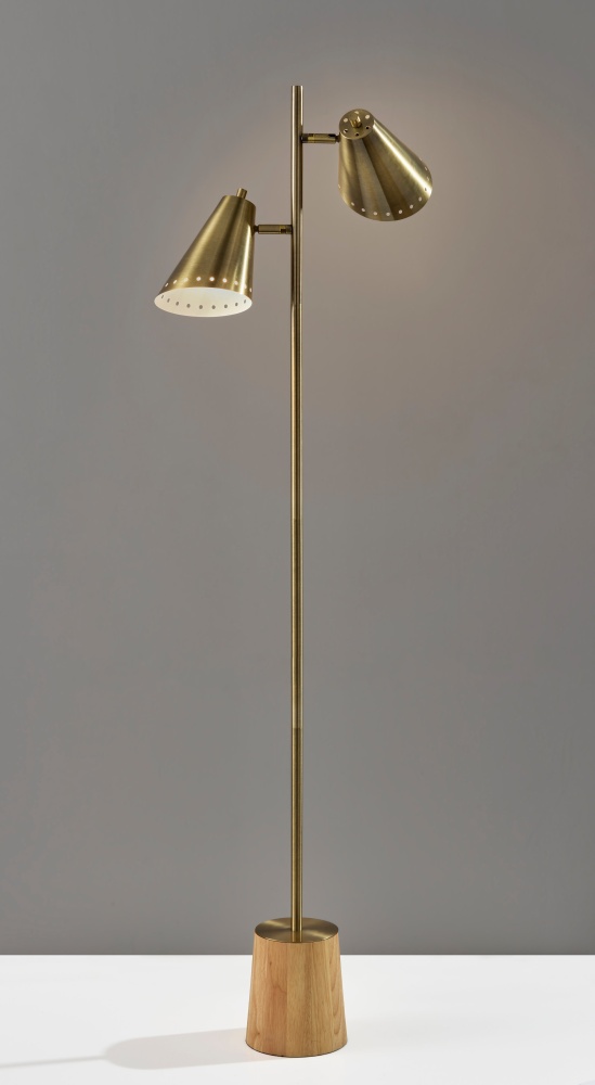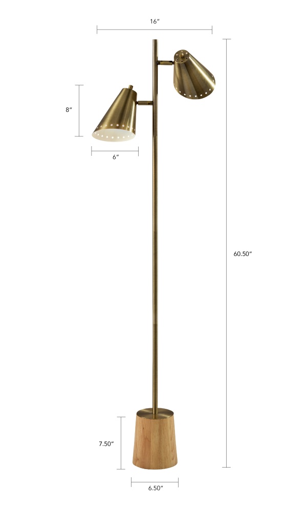 Introducing the 9411-21 Josephine Floor Lamp, a stunning blend of elegance and function that adds sophistication to any room. Featuring an antique brass finish and two adjustable cone-shaped brass metal shades, this lamp offers both style and versatility. Standing at 60.5 inches tall with a chunky natural wood base for added stability and charm, the Josephine Floor Lamp brings a warm, modern touch to your home. Each shade is equipped with its own 40W on/off rotary socket switch, providing flexible lighting options perfect for reading, working, or relaxing.