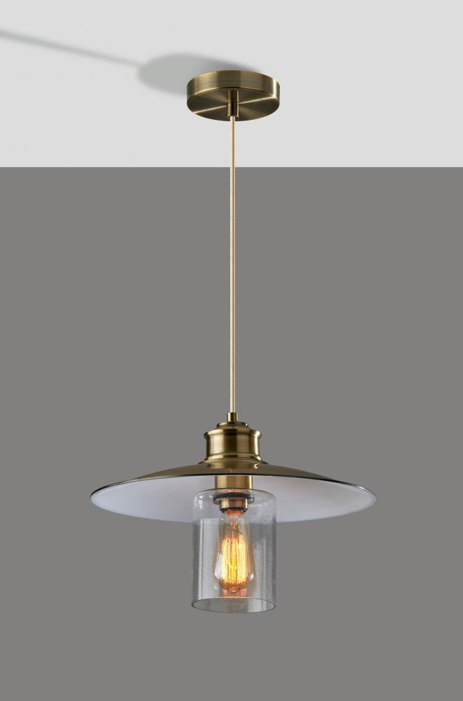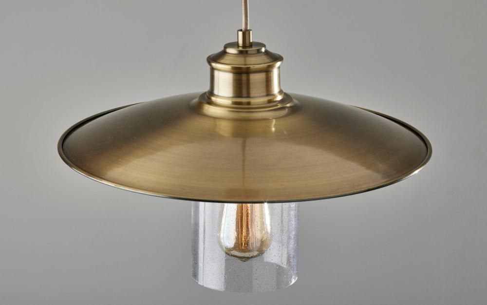Brighten your space with the metallic warmth and elegant styling of the Kieran pendant light. Its antique brass finish and clear seeded glass shade complement both pared-down styling and ornately detailed looks. Hang this pendant by itself or pair it with several more to create a stunning effect and add illumination to your bathroom, living room, dining room, or entryway. With a 6? beige fabric-covered cord, the height of the light can be adjusted to suit the needs of any room regardless of the ceiling height, making it a must-have addition to any space. This pendant mounts to your ceiling with a round base in antique brass finish. Topping the light's shade is a classically embellished antique brass dome above a cylindrical glass piece made of seeded clear glass. The glass shade leaves the included 40W vintage Edison bulb visible for a striking look. Complete your décor with the coordinating Kieran wall lamp, floor lamp, and desk lamp.