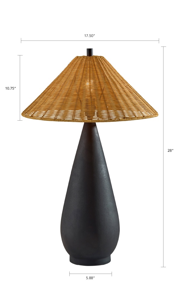 Introducing the 9405-01 Lorelei Table Lamp, a beautiful fusion of modern design and natural texture. Featuring a teardrop-shaped rough-finished black ceramic base, this lamp brings a bold yet refined touch to your decor. The tapered brown rattan shade complements the base with its organic texture, creating a warm and inviting glow. Standing at 28 inches tall, the Lorelei Table Lamp is ideal for enhancing living rooms, bedrooms, or entryways. Equipped with a 100W on/off rotary socket switch, it provides both functionality and stylish lighting.