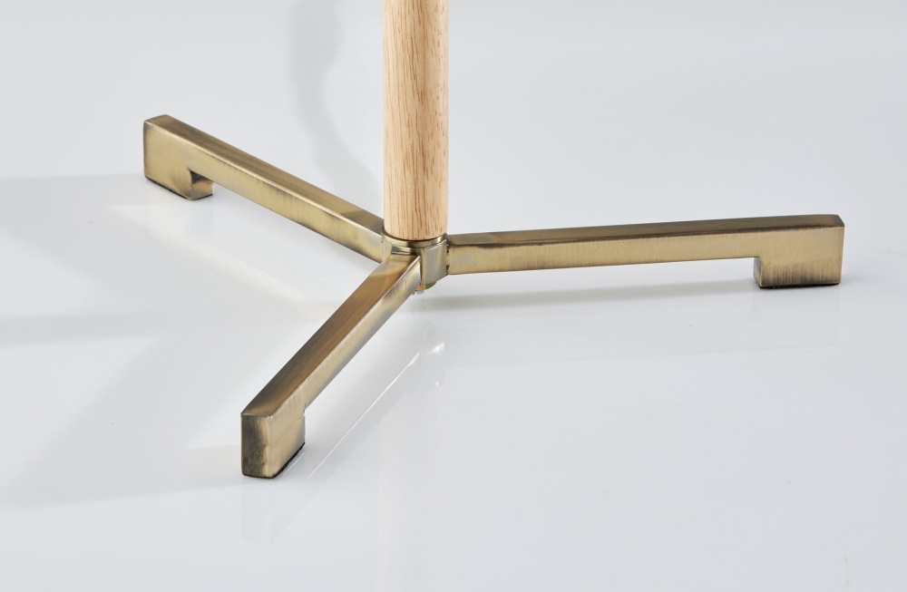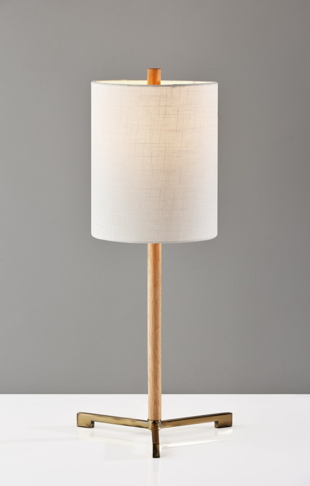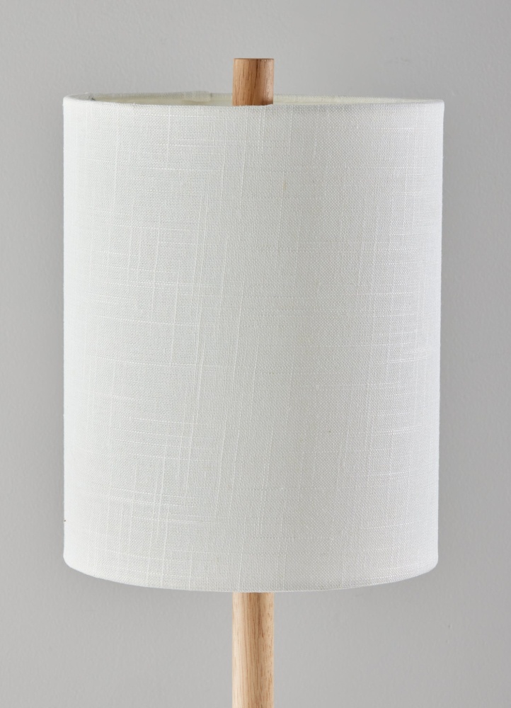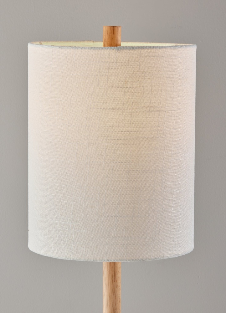 Illuminate your room with the simple, natural style of the Maddox table lamp. The 27" tall lamp features a 13" diameter tripod base in antique brass supporting a slender light oak wood stem. The table lamp is topped by a tall drum shade made of white textured fabric to softly diffuse light from a 100W bulb. Easily operated by a pull chain switch, the lamp is also powered by a 5' clear cord. Complete your decor with the coordinating Maddox floor lamp.