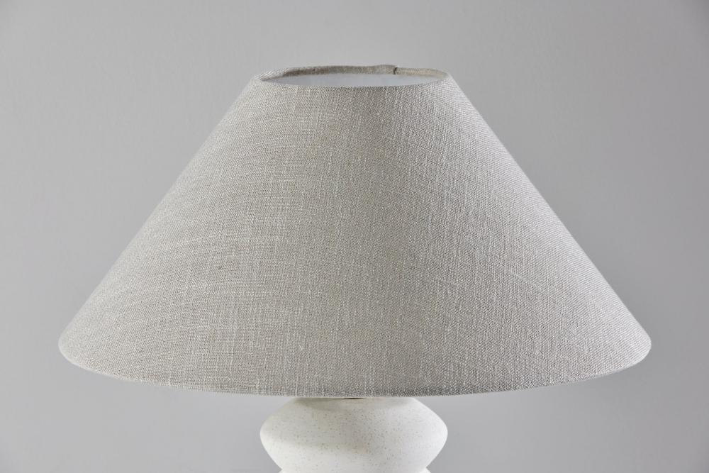 Taupe Textured Shade: The tapered taupe textured fabric shade adds depth and texture to the lamp's design, harmonizing with the ceramic base for a cohesive look.