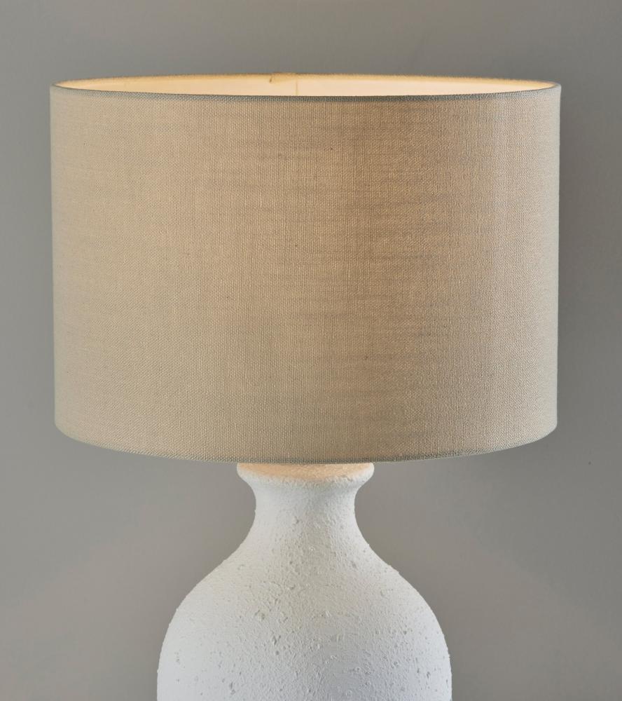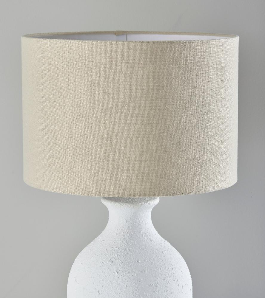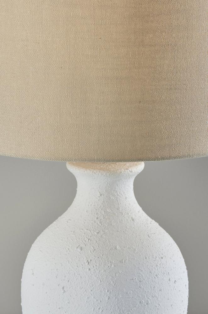 Drawing on farmhouse and coastal stylings, the Margot table lamp brings softened warmth to living rooms, bedrooms, and offices. The white jug-shaped ceramic base features thick texturing and is perfectly offset by a 15" diameter and 10" tall light beige fabric drum shade. When the 100W bulb is lit, it highlights the texturing of the fabric shade for a soft, warm look. For a contemporary, contrasting style, the Margot table lamp is also available with a black ceramic base and light brown fabric shade.