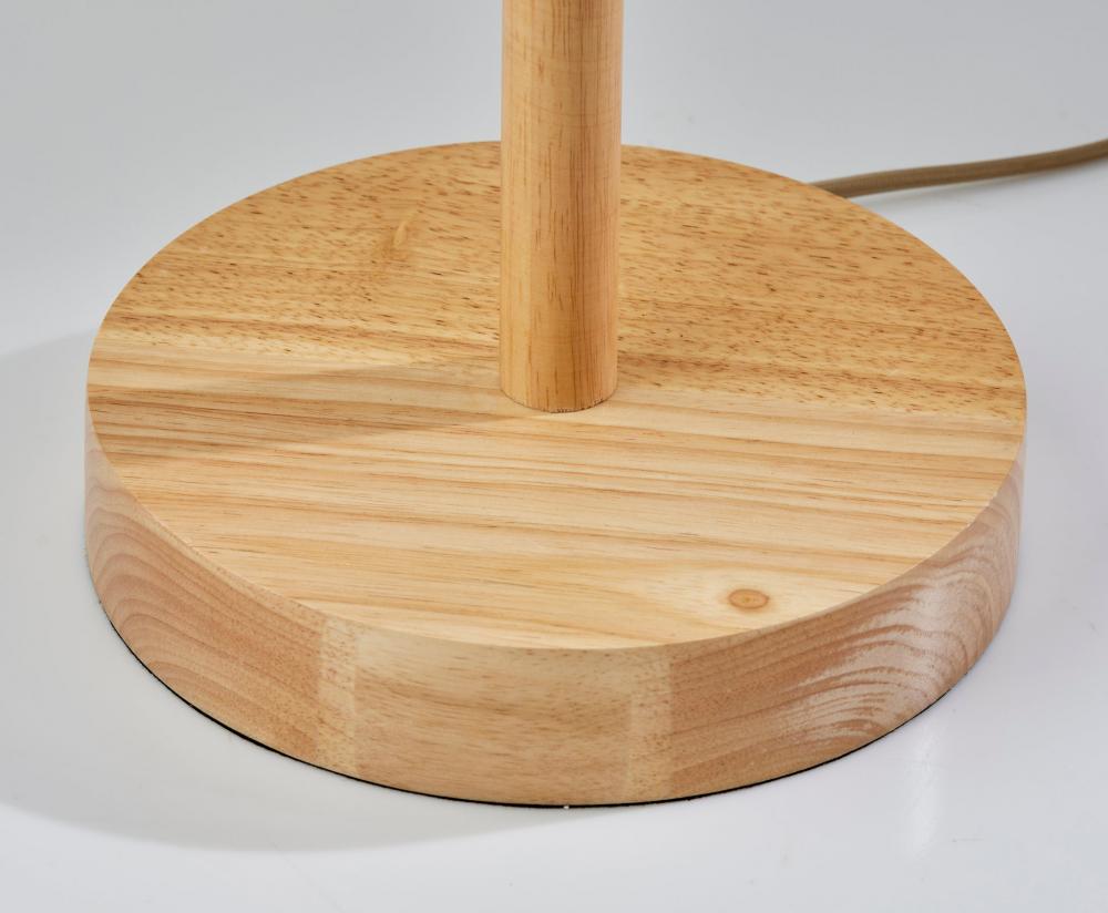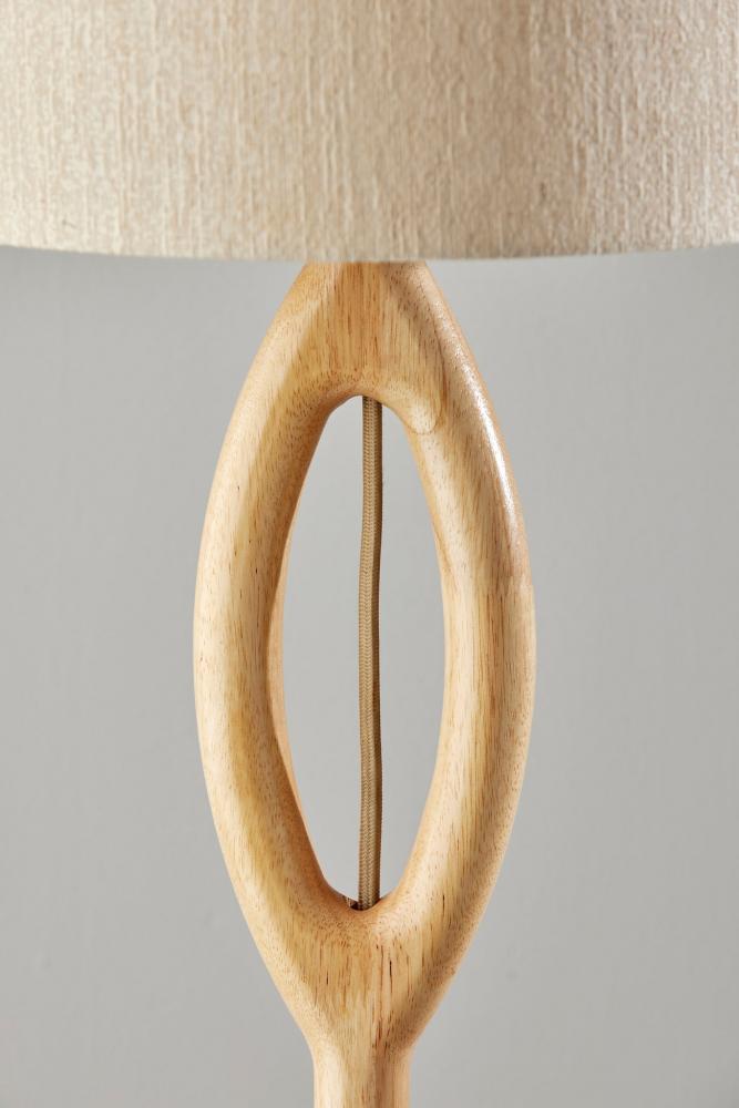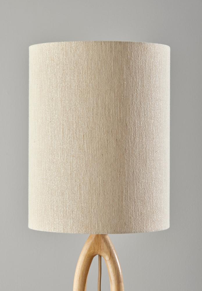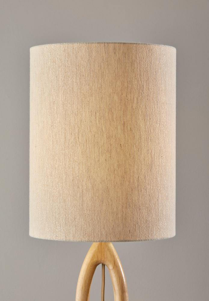 The Mayfair floor lamp's warm, elegant design adds style to any space. A 10" round base supports a contoured silhouette fashioned of natural wood that highlights the wood grain. The open design spotlights the beige fabric-covered power cord running through the center. Topping the lamp is a textured, light beige drum shade that softly diffuses the light from a 100W bulb. The lamp is easily operated by a rotary socket switch. To complement contemporary styling, the table lamp is also available with black wood construction and a light grey shade. Complete your décor with the coordinating Mayfair table lamp.