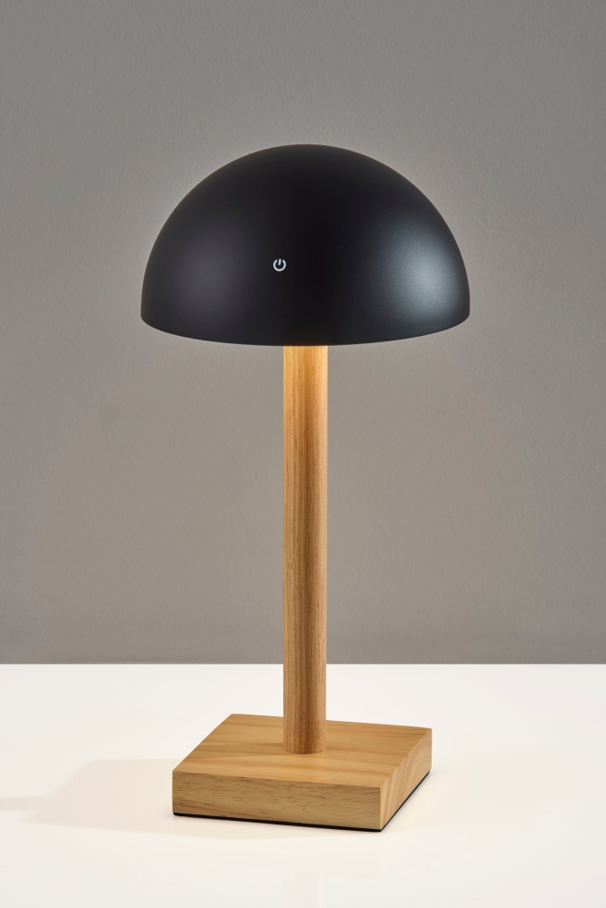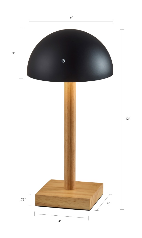 Introducing the 4065-01 Nash LED Cordless Table Lamp, a sleek and functional lighting solution designed for modern living. Featuring a natural wood base and a black dome-shaped shade, this lamp effortlessly blends contemporary style with organic warmth. Standing at 12 inches tall, it is equipped with a 1.5W LED light powered by a 2000mAh rechargeable battery, making it portable and perfect for any space. The 3-level touch step dimmer allows for easy brightness adjustment, giving you control over the ambiance whether indoors or outdoors.