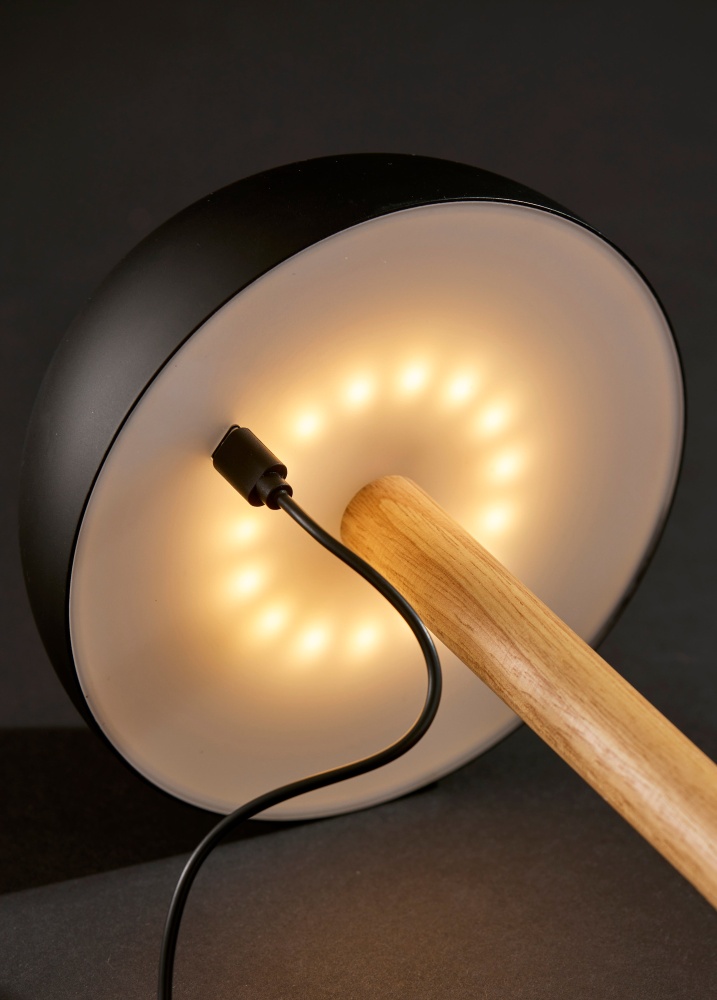 Sleek design: Natural wood base and black dome-shaped shade for a modern, stylish look.