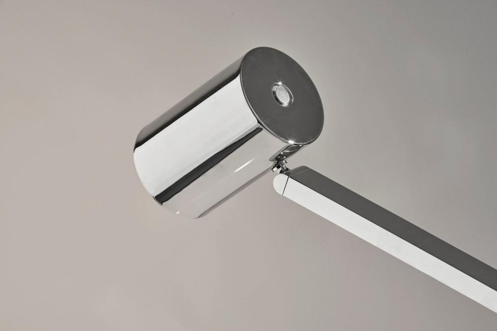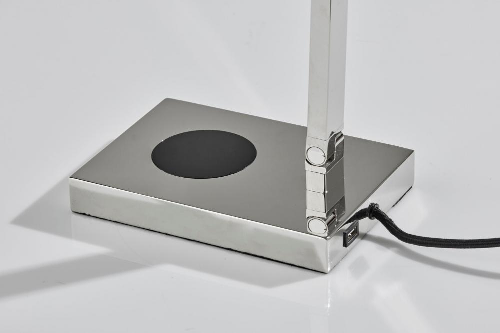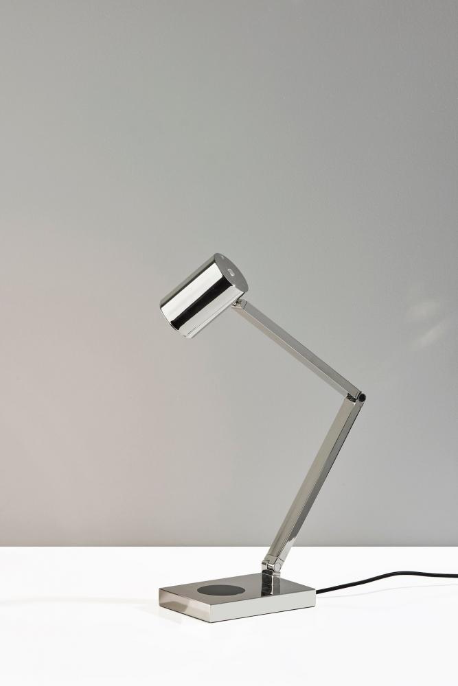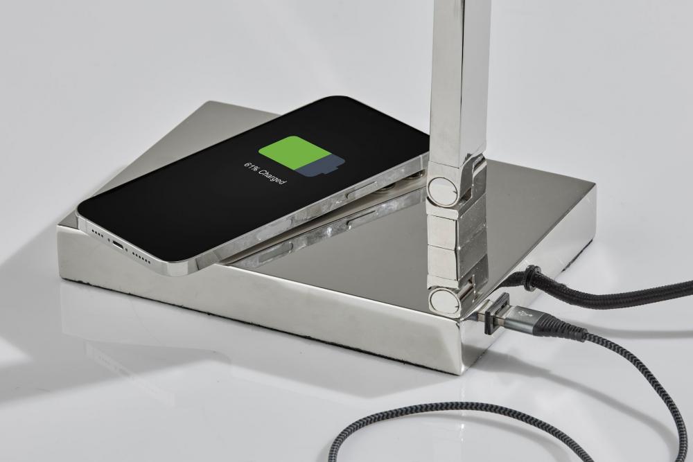 Modern functionality and industrial styling meet in the Newman Task Lamp. This high end desk lamp has a polished nickel finish and is adjustable at 3 points to direct light exactly where it is needed. A polished nickel cylinder shade houses an integrated, eco-friendly 10W LED light that is replaceable. With a 4-way touch switch conveniently located on the base, this lamp offers a 3 levels of brightness, making the perfect lighting available at the touch of a finger. For added functionality, the base of the lamp houses an integrated Qi-certified charging pad, supporting 5W charging on contact to get your phone from 0% to 100% in just 3-4 hours. A USB port is also located on the side of the base for charging a second device simultaneously. The lamp is powered by a 5' black fabric covered cord.