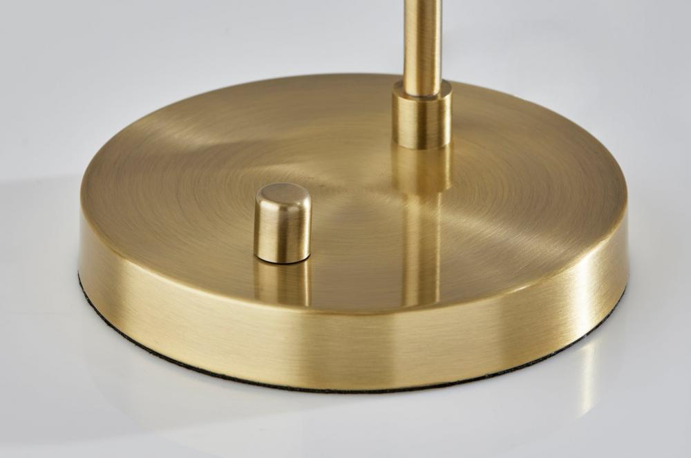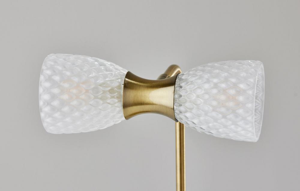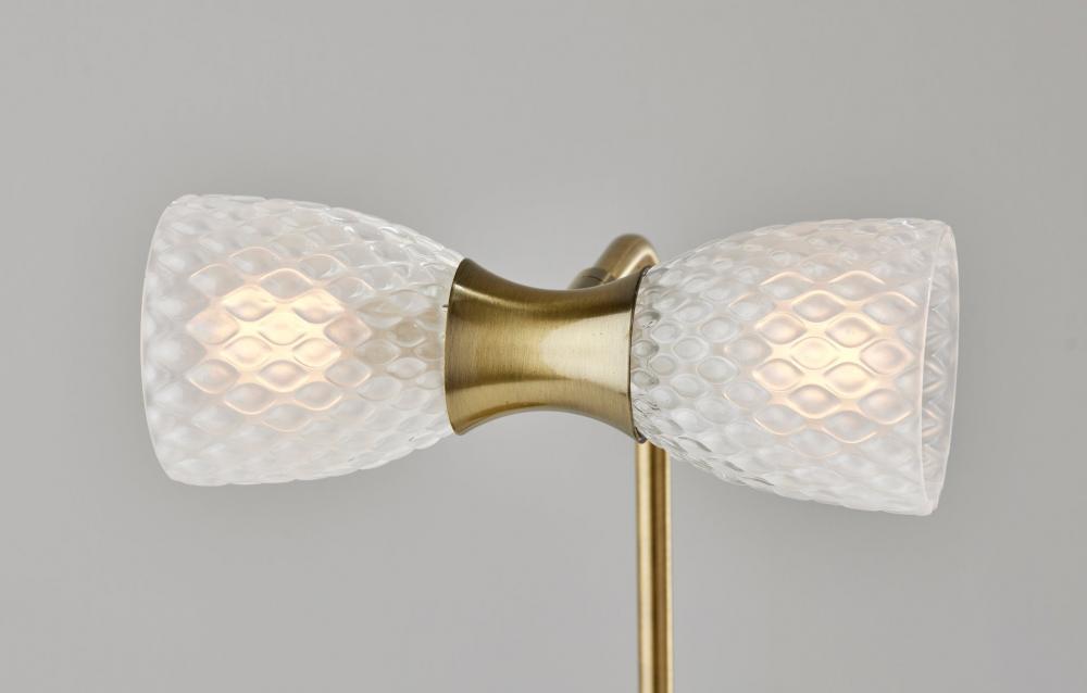 Brighten your space with the style and functionality of the Nina LED desk lamp. Crafted with an antique brass finish and featuring delicate glass texturing, this lamp complements Victorian or farmhouse décor. A 7" diameter round base supports a narrow matching stem. Suspended from the stem are dual textured milk glass shades that are connected with an hour-glass shaped accent piece in antique brass finish. The two included 3W replaceable LED bulbs throw a soft, warm white light and are compatible with full-range dimmers, allowing you to adjust the brightness as needed for either task lighting or an accent light. For added versatility, the base of the lamp shade features an articulation point, allowing you to rotate and redirect the shade for a variety of looks and lighting options. Complete your décor with the coordinating Nina LED wall lamp and floor lamp.