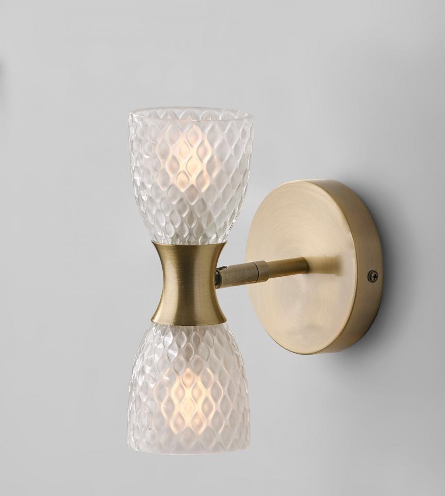 Brighten your space with the style and functionality of the Nina LED wall lamp. Crafted with an antique brass finish and featuring delicate glass texturing, this sconce complements Victorian or farmhouse décor. For symmetrical design, pair two of these sconces on either side of beds, fireplaces, or mirrors or place individually in entryways or other spaces for a pop of light. A 5" diameter round mount supports the dual textured milk glass shades that are connected with an hour-glass shaped accent piece in antique brass finish. The two included 3W replaceable LED bulbs throw a soft, warm white light and are compatible with full-range dimmers, allowing you to adjust the brightness as needed. For added versatility, the base of the lamp shades features an articulation point, allowing you to rotate and redirect the shades for a variety of looks and lighting options. Complete your décor with the coordinating Nina LED desk lamp and floor lamp.