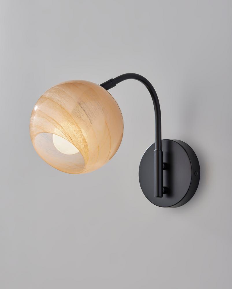 Add warmth and timeless style to your space with the Nolan wall lamp. For symmetrical design, pair two of these sconces on either side of beds, fireplaces, or mirrors or place individually in entryways or other spaces for a pop of light. A round 5" diameter base crafted of black metal supports a slender arcing stem. Suspended from the stem is a stunning glass globe with an eye-catching beige swirl pattern that throws warm light from a 40W bulb. For versatile lighting options, an articulation point at the base of the glass globe allows you adjust the shade, directing the light wherever it's needed. Complete your décor with the coordinating Nolan desk lamp, floor lamp, arc floor lamp, flush-mount ceiling light, and pendant light.