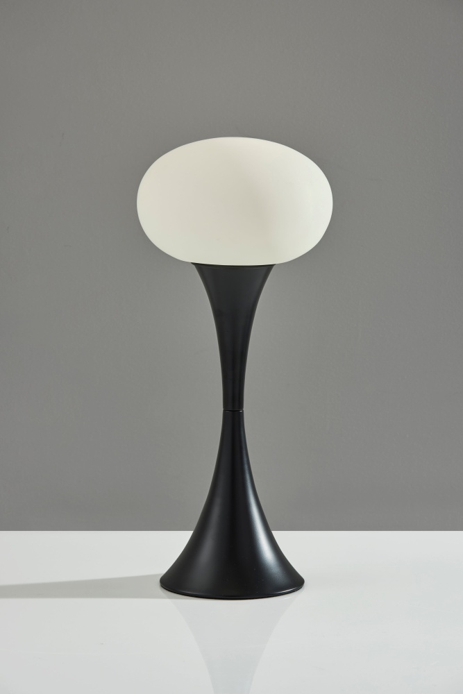 Introducing the 2603-01 Otis Table Lamp, a striking addition to any modern space. With its sleek black finish and minimalist design, this lamp brings contemporary elegance to your home or office. The frosted acrylic globe-shaped shade casts a soft and inviting glow, creating a warm ambiance in any room. Standing at 19 inches tall, it's the perfect height for bedside tables, desks, or accent tables. The tapered hourglass-shaped base adds a touch of sophistication, while the convenient On/Off touch switch allows for easy operation. Illuminate your space with style and functionality with the Otis Table Lamp.