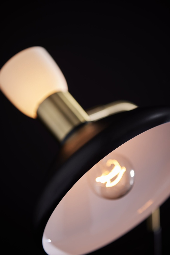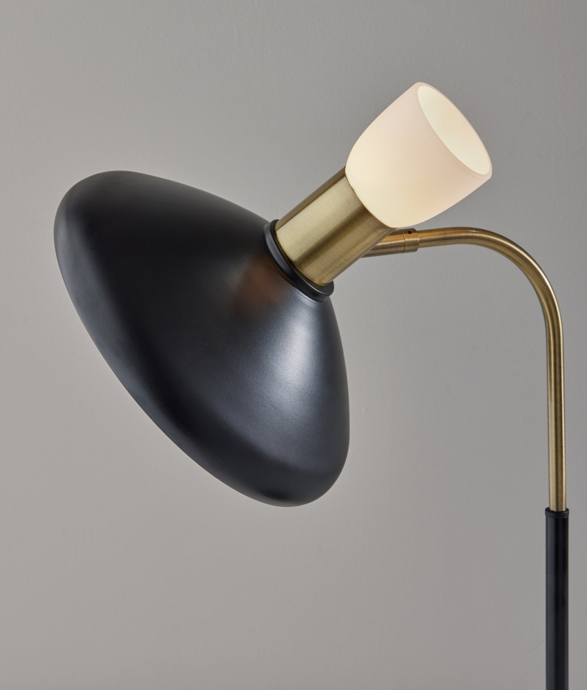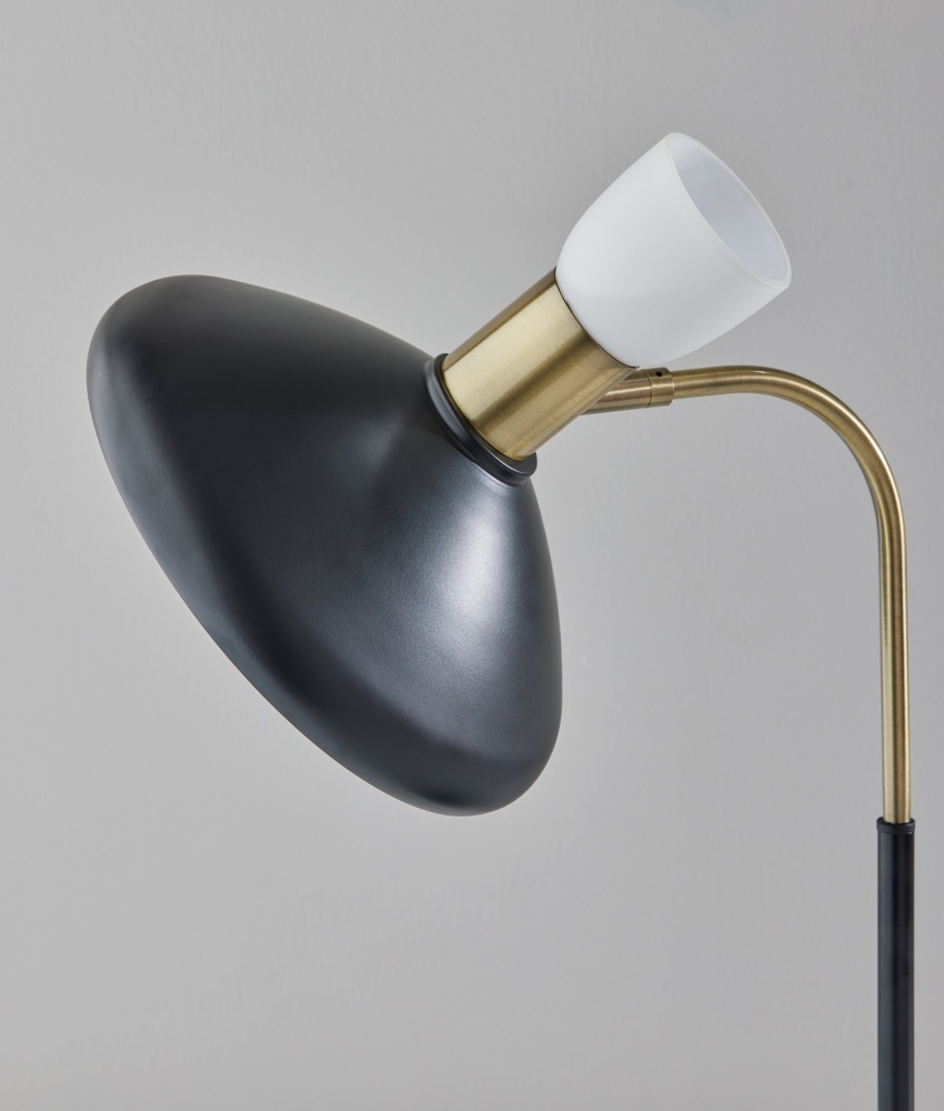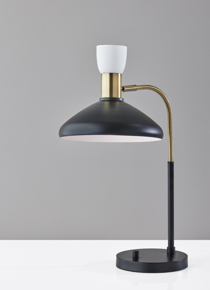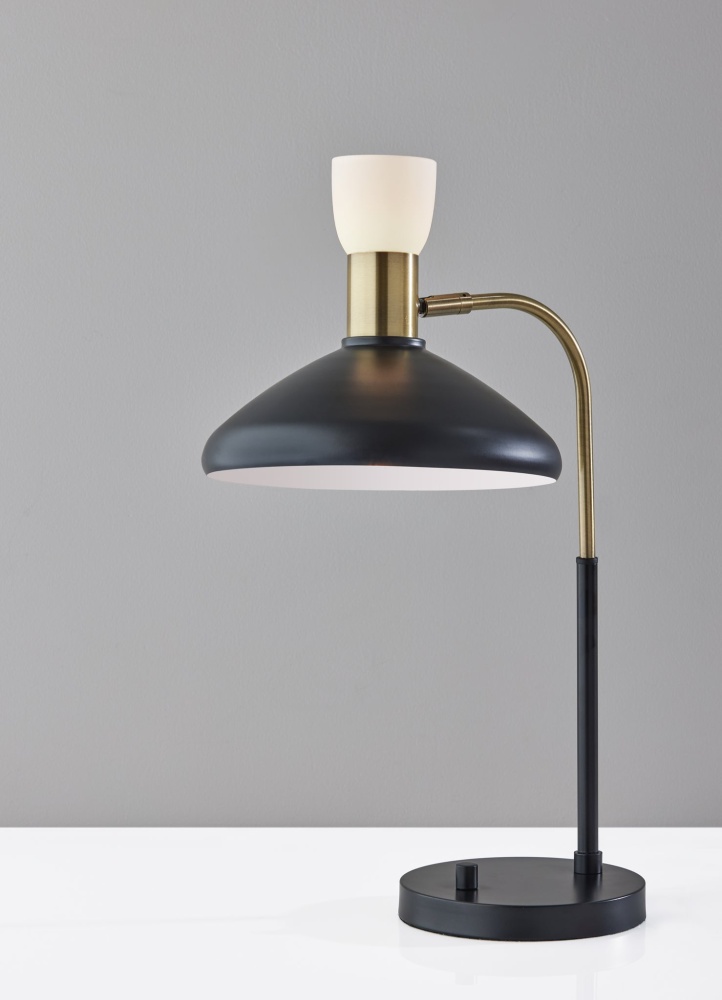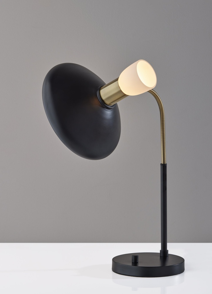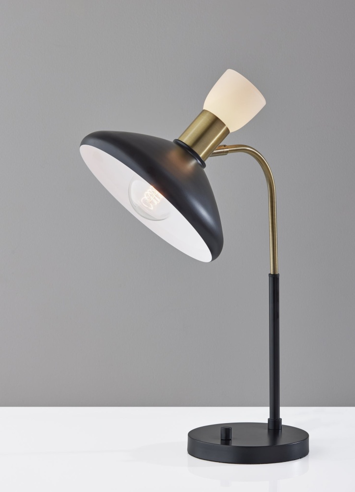 The 21" tall Patrick desk lamp offers versatile task lighting while blending industrial, modern chic, and mid-century modern design for the perfect addition to your desk or side table. Featuring a mix of metal finishes, the round black base leads to a black tube that transitions to a slim, antique brass stem. The antique brass finish continues through the base of the lamp head for a stylish contrast to the black metal. For a distinct look and versatile lighting options, the desk lamp features dual lampshades. The main light is surrounded by a large, 10" diameter round shade with a black metal exterior and white finish on the interior that directs the light from a 40W bulb downwards. With the shade opening leaving the lightbulb exposed, a vintage Edison bulb (not included) makes for an eye-catching addition. The smaller , 3" diameter lampshade is constructed of frosted glass and directs warm light upwards from the included 3W LED light. For multifunctional lighting options, the lamp head can be pivoted both up and down and side to side, allowing you to direct the light wherever it's needed. A 4-way rotary switch located on the lamp base allows you to set the best lighting for your needs: only the main light illuminated, only the LED light illuminated, or both illuminated together. Complete your decor with the coordinating Patrick floor lamp.