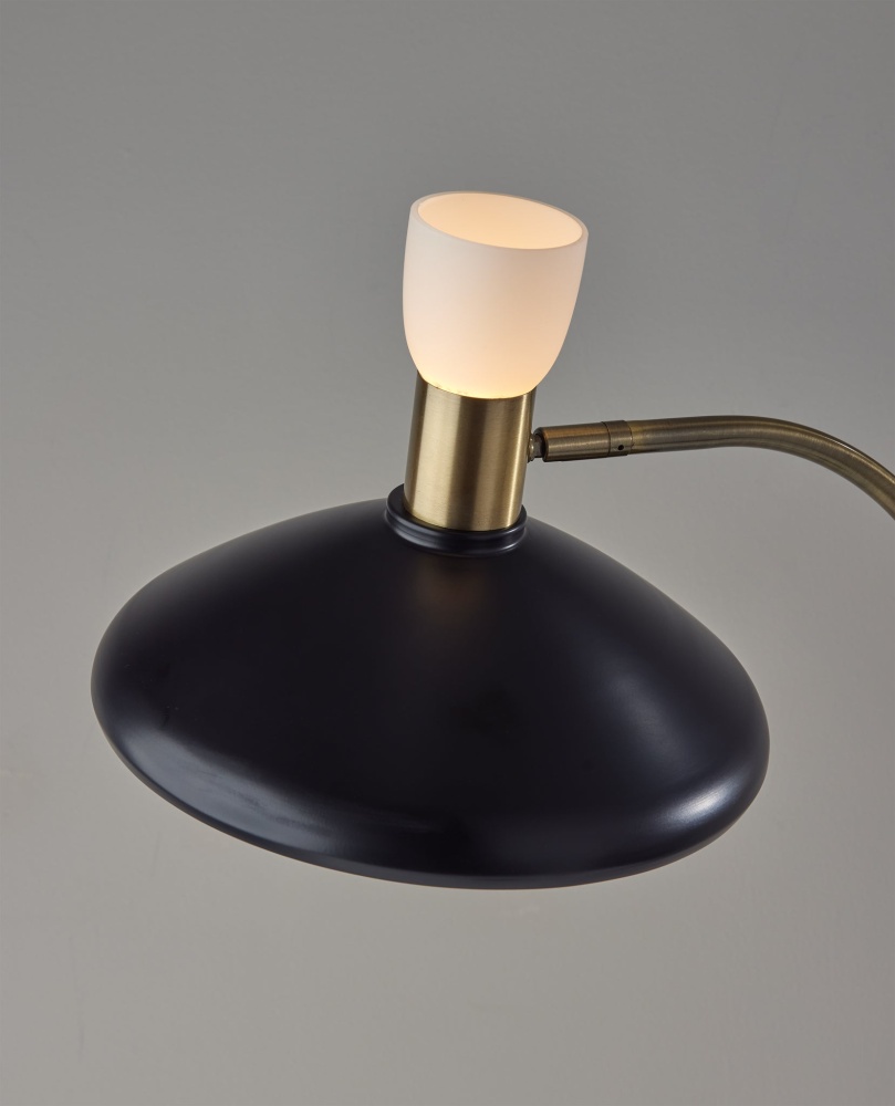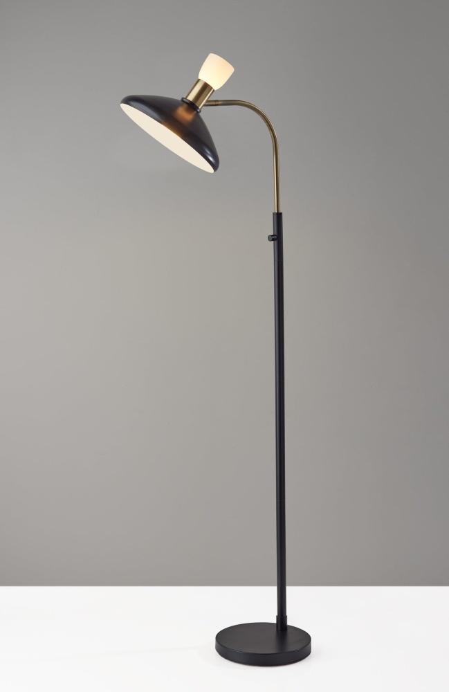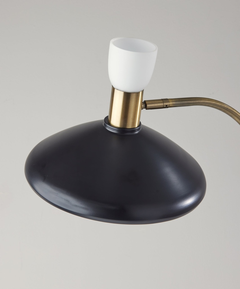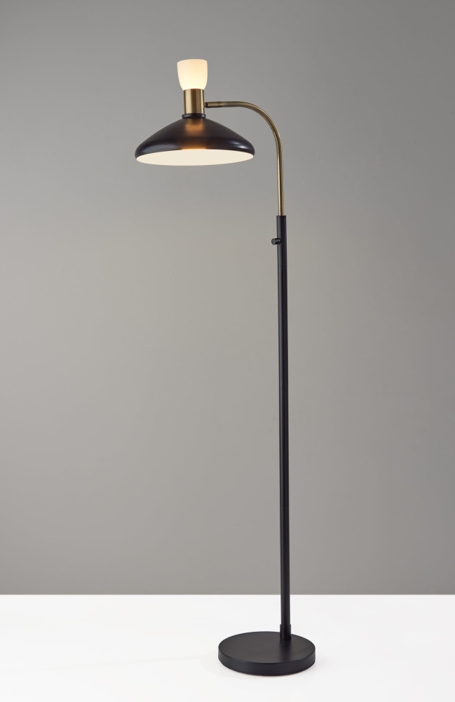 The 61" tall Patrick floor lamp offers versatile lighting while blending industrial, modern chic, and mid-century modern design for the perfect addition to your space. Featuring a mix of metal finishes, the round black base leads to a black tube that transitions to a slim, antique brass stem. The antique brass finish continues through the base of the lamp head for a stylish contrast to the black metal. For a distinct look and versatile lighting options, the desk lamp features dual lampshades. The main light is surrounded by a large, 11.5" diameter round shade with a black metal exterior and white finish on the interior that directs the light from a 60W bulb downwards. With the shade opening leaving the lightbulb exposed, a vintage Edison bulb (not included) makes for an eye-catching addition. The smaller , 3" diameter lampshade is constructed of frosted glass and directs warm light upwards from the included 3W LED light. For multifunctional lighting options, the lamp head can be pivoted both up and down and side to side, allowing you to direct the light wherever it's needed. A 4-way rotary switch located on the lamp pole allows you to set the best lighting for your needs: only the main light illuminated, only the LED light illuminated, or both illuminated together. Complete your decor with the coordinating Patrick desk lamp.