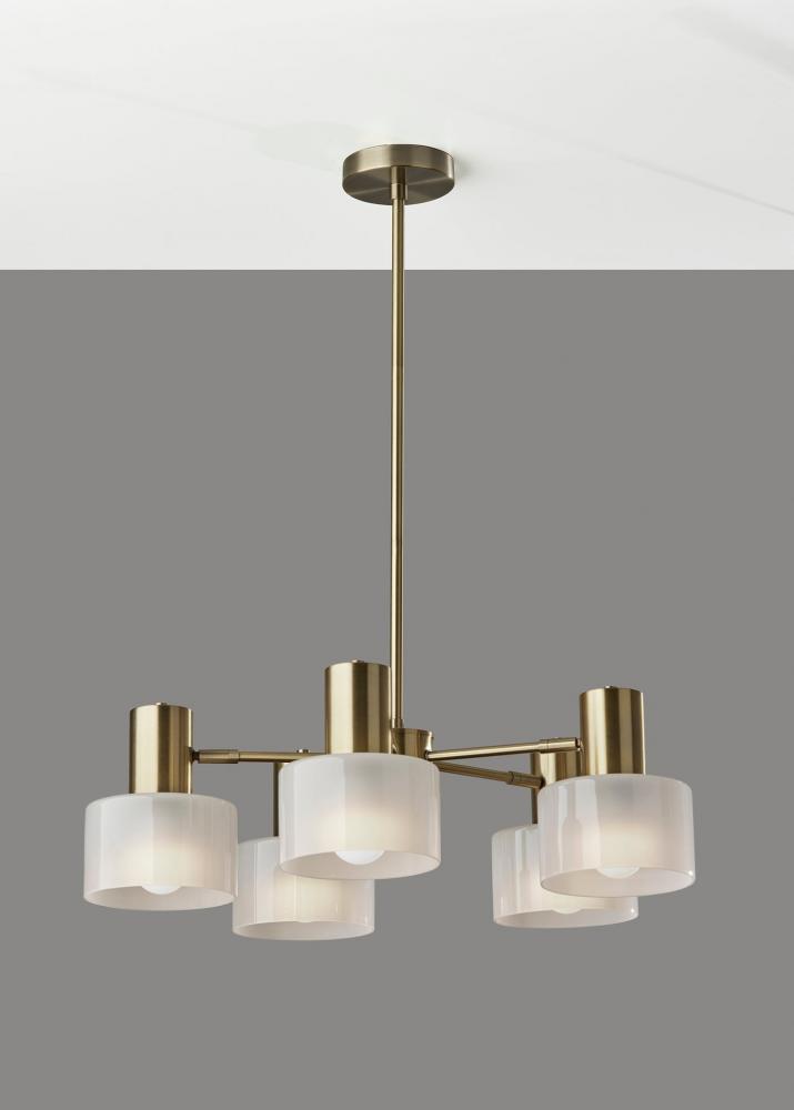 Introducing the 3938-21 Rhodes Chandelier, a masterful blend of elegance and versatility that effortlessly harmonizes timeless design with modern sophistication. This chandelier showcases an Antique Brass finish that bestows vintage charm and sophistication upon your decor. Its five glass shades create a captivating contrast, with glossy white exteriors exuding contemporary flair, while the frosted interiors diffuse a soft and inviting glow. What truly distinguishes the Rhodes Chandelier is its adjustability—each of the five shades can be positioned independently, allowing you to craft a tailored lighting arrangement. Designed to serve as both an illumination source and a focal point, this chandelier also offers customization. Included are two extra 8-inch poles, enabling you to adapt the lamp's height to match your ceiling height perfectly. With its timeless design and understated elegance, the Rhodes Chandelier enhances the ambiance of your space, illuminating it with sophistication and adaptability.