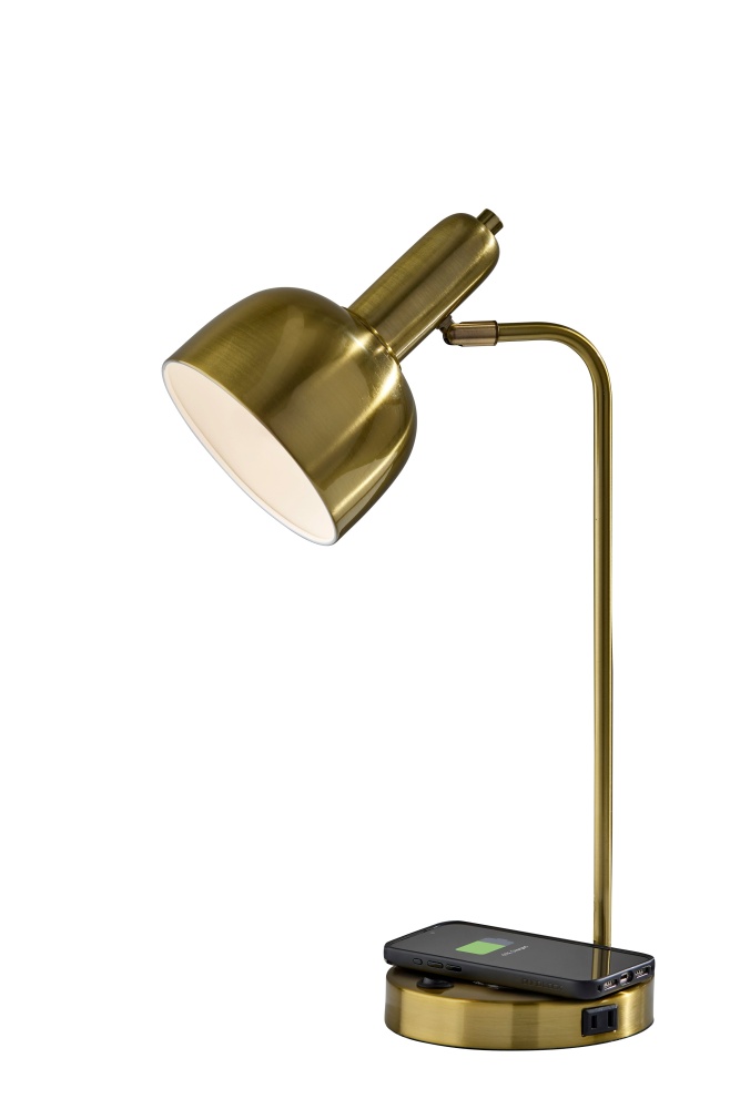 The Rico Supercharger Desk Lamp is where sleek design meets smart functionality. Available in antique brass or brushed steel finishes, this 19" desk lamp features an adjustable shade and a clean, modern profile that enhances any workspace. Designed for today’s tech-driven lifestyle, the base includes a 2 amp USB-A port, a 2 amp USB-C port, an AC outlet, and a built-in 10W Qi wireless charging pad—making it a powerful hub for your daily essentials. The on/off rocker switch on the base ensures easy operation, blending convenience with contemporary style.