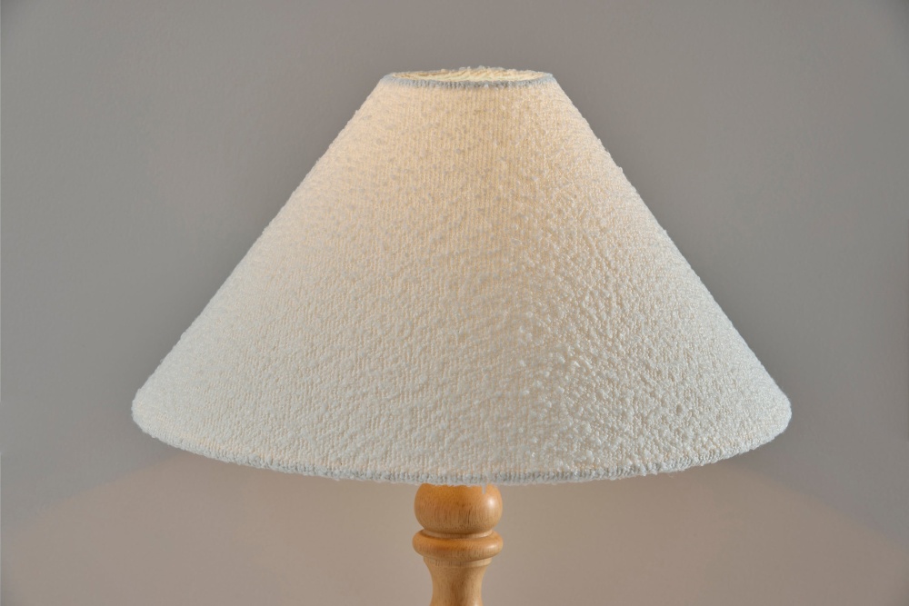 Soft illumination: Tapered white boucle fabric shade diffuses light for a gentle, inviting glow.