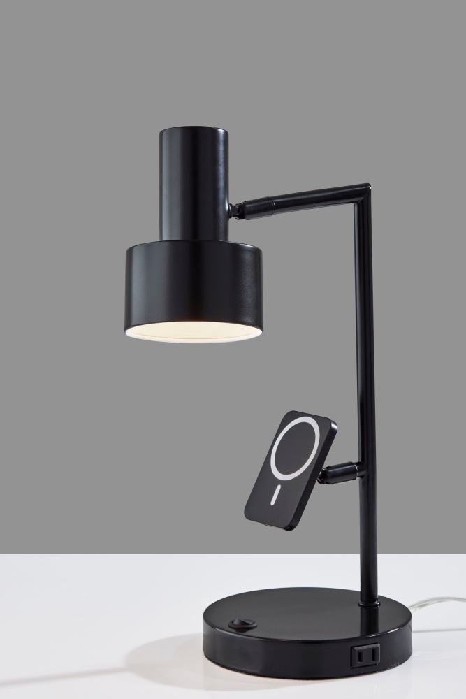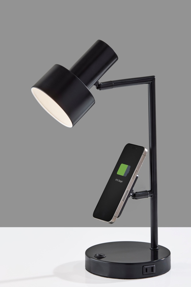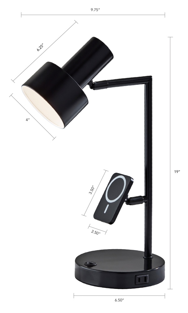 The Rowe Supercharger Desk Lamp is a high-performance lighting solution designed for the modern, connected workspace. Available in black, antique brass, or brushed steel finishes, this 19" lamp features an adjustable shade and a sleek silhouette that complements any desk. The base is a powerhouse of functionality, equipped with a 2 amp USB-A port, 2 amp USB-C port, AC outlet, and a 10W Qi wireless charging pad mounted on an adjustable magnetic stand for optimal phone positioning. With an easy-to-use on/off rocker switch on the base, Rowe delivers both style and smart convenience.