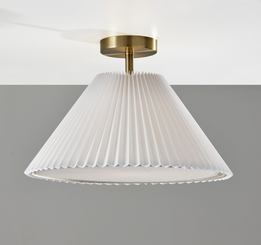 Introducing the 3801-21 Scarlet Flush Mount, a captivating addition to your home lighting ensemble. With its antique brass finish and pleated off-white tapered fabric shade, this flush mount exudes vintage charm and timeless elegance. Hardwire compatible, it seamlessly integrates into your ceiling for a polished look that enhances any room. Illuminate your space with sophistication and style, courtesy of the Scarlet Flush Mount.
