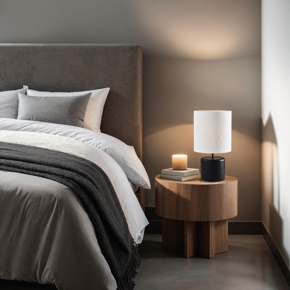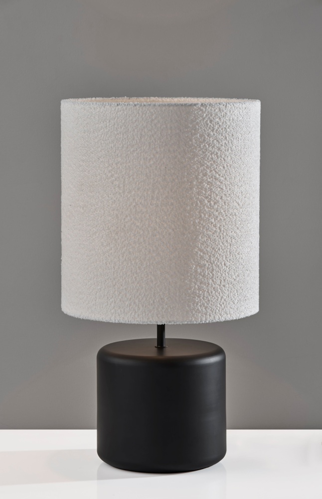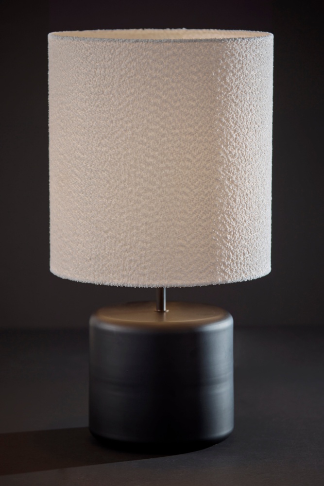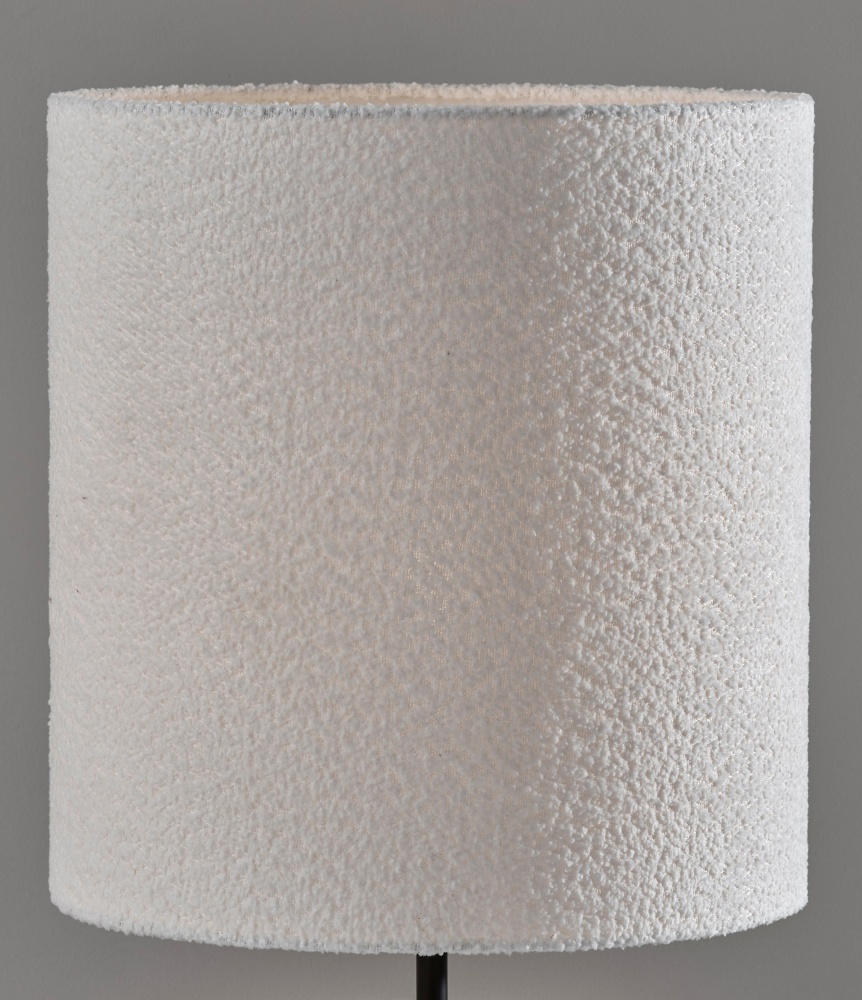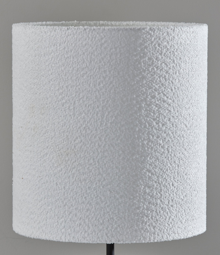 White boucle fabric drum shade provides unique texture and soft light diffusion.