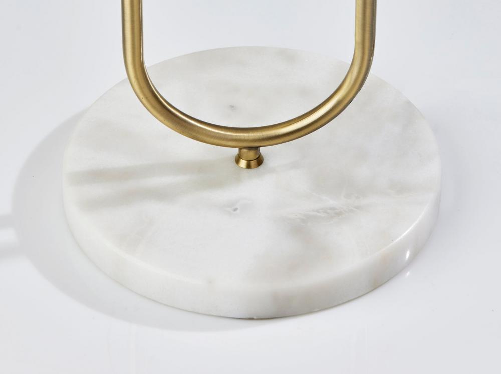 Elegant Fusion: The 2159-21 Terra Shelf Floor Lamp features an antique brass finish and a white marble base, effortlessly blending timeless elegance with practical design.