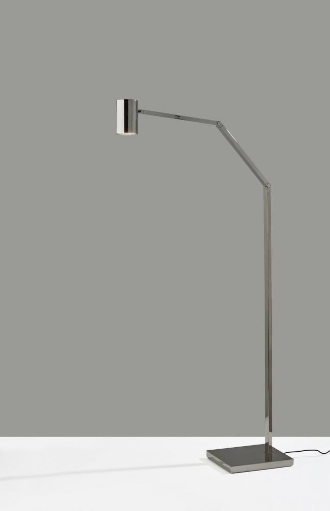 A flexible task light, the Crane LED Floor lamp has a long arm that is easy to adjust in height and rotation. A polished nickel finish, accented with a black fabric cord communicates a polished, contemporary look. The Crane makes use of its black cloth covered cord and a special spring hidden in the base to balance its arm at any angle you choose to pose it. A small but powerful cylinder shade holds an energy-efficient 7 Watt LED lthat is replaceable. The simple 4-way touch dimmer switch is located at the end of the shade.