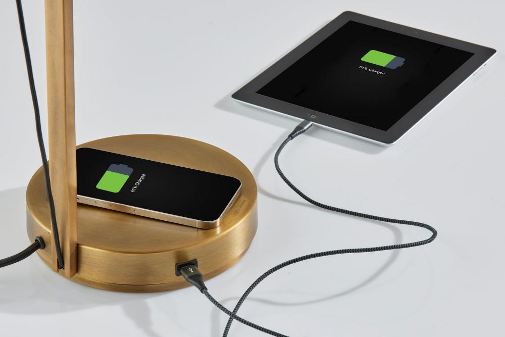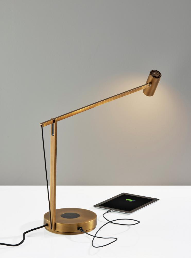 A flexible task light, the Crane LED desk lamp has a long arm that is easy to adjust in height and rotation. A lacquered burnished brass finish, accented with a black fabric cord communicates a polished, contemporary look. The Crane makes use of its black cloth covered cord and a special spring hidden in the base to balance its arm at any angle you choose to pose it. A small but powerful cylinder shade holds an energy-efficient 7 Watt LED lthat is replaceable. The simple 4-way touch dimmer switch is located at the end of the shade. For added functionality, the base of the lamp houses an integrated Qi-certified charging pad, supporting 5W charging on contact to get your phone from 0% to 100% in just 3-4 hours. A USB port is also located on the side of the base for charging a second device simultaneously.