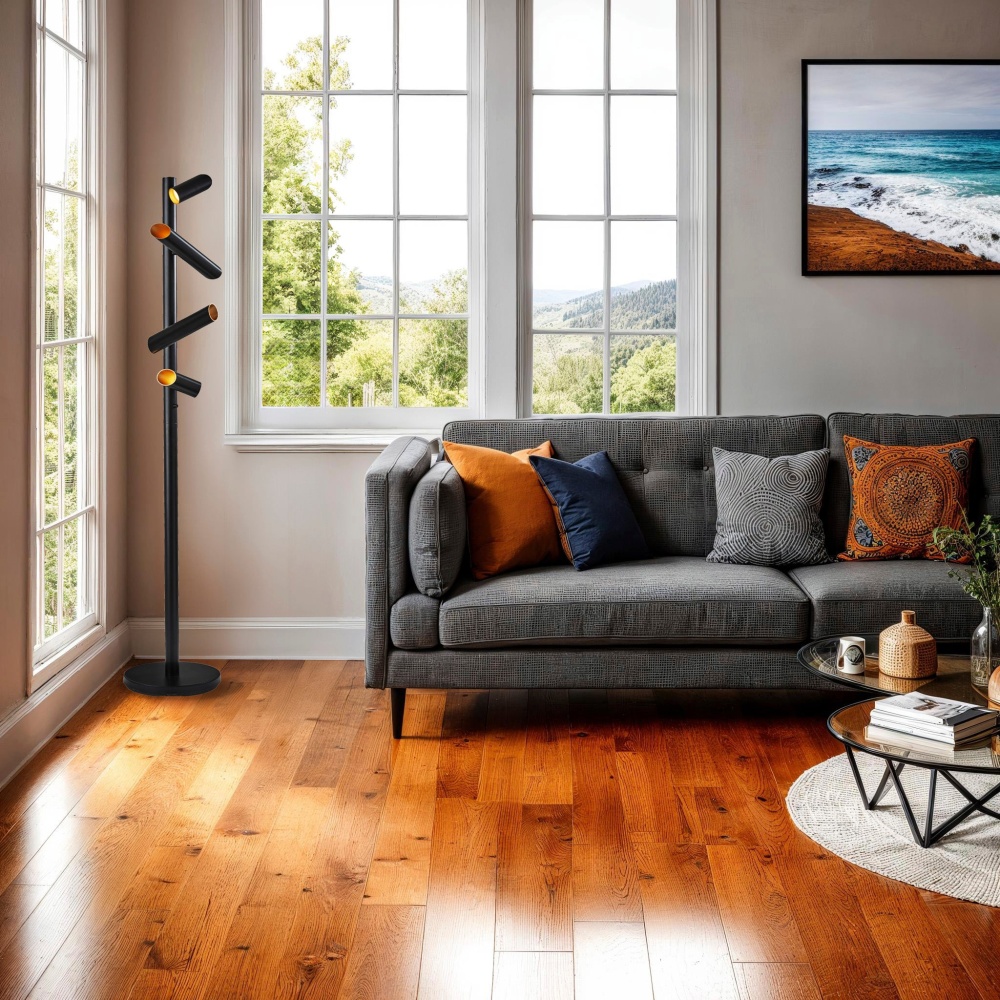 An edgy accent to any room, the Tyler LED Floor Lamp is the perfect choice to upgrade your contemporary style. Four black cylinder shades with slanted edges have LED's on both ends for double the amount of light! With a wide range of lamp shade adjustability and a full range dimmer switch, this lamp can provide anything from bright ambient lighting to light up an intire room to dim directive lighting for night time reading. The Tyler LED Floor Lamp also has a 2 thick pole and a 14 base, making this design a substantial, statement making piece of home decor.