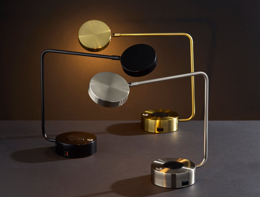 Sleek, modern design: Available in black, brushed steel, or antique brass with an adjustable disc-shaped LED shade.