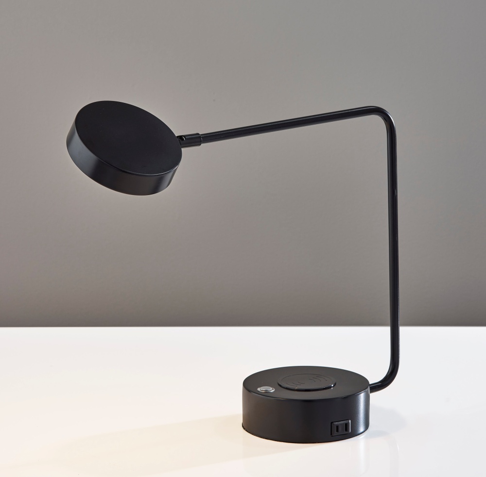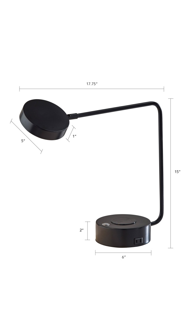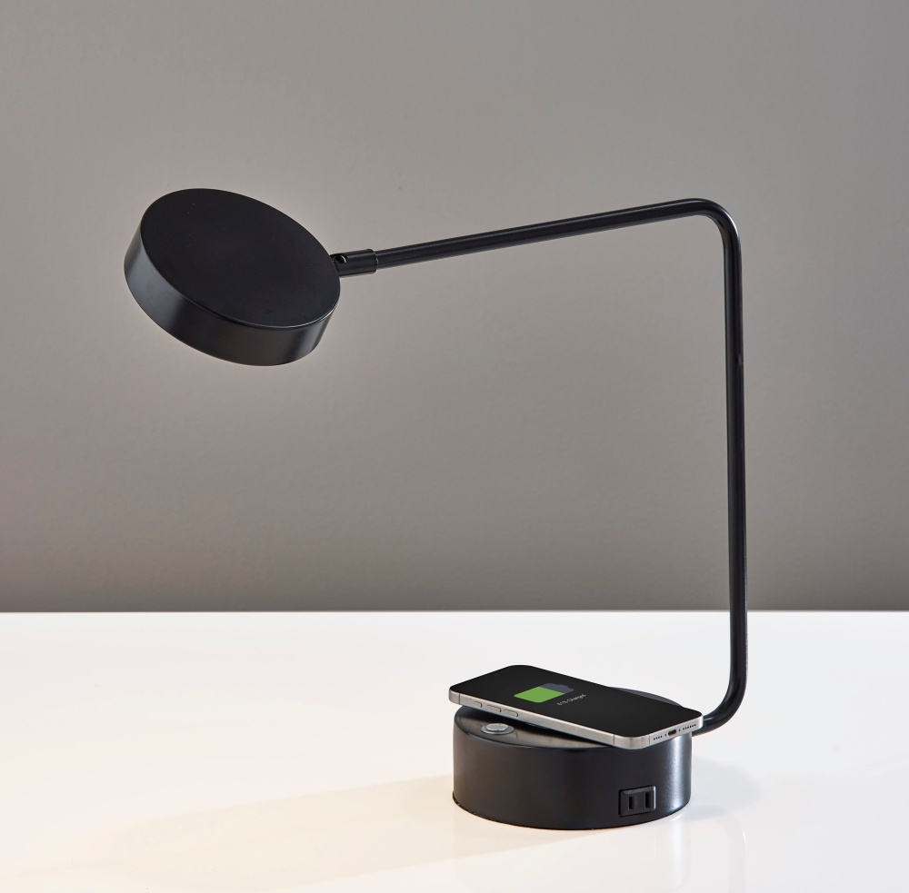 The Viper Supercharger LED Desk Lamp delivers precision lighting and powerful charging, all wrapped in a sleek, modern design. Available in black, brushed steel, or antique brass finishes, this compact 15" lamp features an adjustable disc-shaped LED shade and a 17.75" reach for targeted task lighting. A 3-level touch switch on the base allows you to fine-tune brightness with ease. The base doubles as a charging hub, equipped with a 2 amp USB-A port, a 2 amp USB-C port, an AC outlet, and a 10W Qi wireless charging pad—making the Viper your ultimate workspace essential.