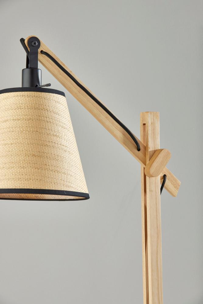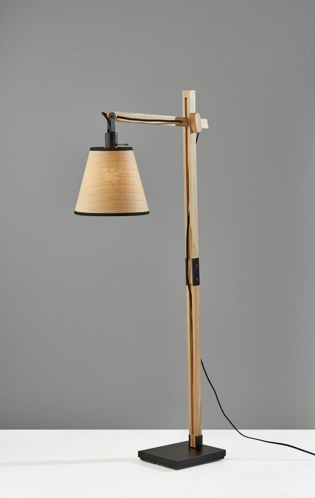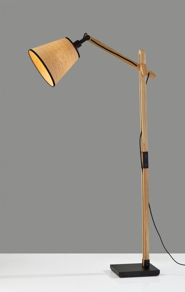 Introduce the Walden floor lamp into rustic, contemporary, or eclectic spaces. Wooden joints adjust the balance arm to change the lamp height and angle of the shade to best serve your room. The black metal base and accents enhance an industrial style, while the natural wood body and natural woven paper shade with black trim along the top and bottom soften the look. For a unique style, the black fabric-covered cord threads through the square wood post body and drapes out the back. A 3-way rotary switch is located on the socket, allowing you to adjust the brightness between low, medium, high, and off to suit your needs. The Walden floor lamp is also available with a black wood construction for a monochrome look. Complete your décor with the coordinating Walden table lamp.