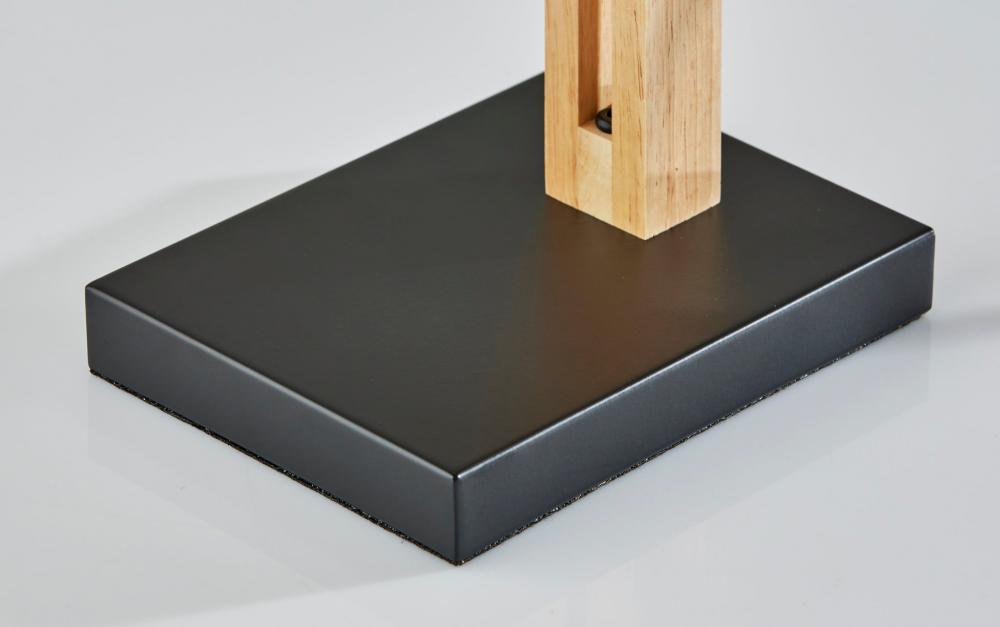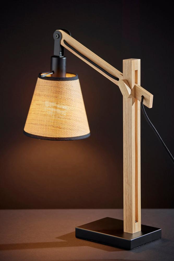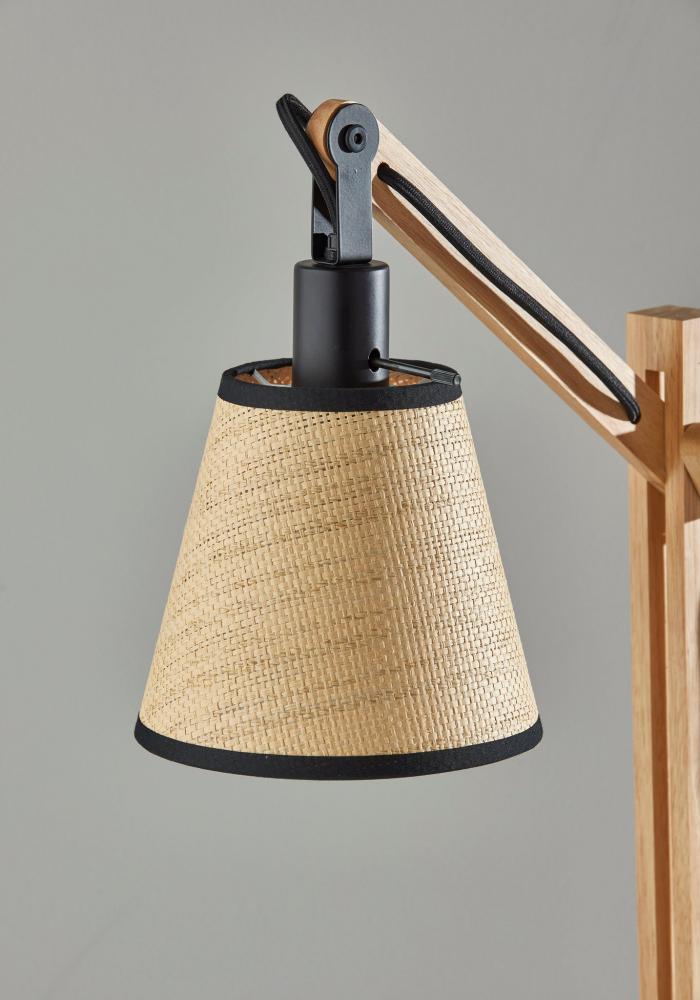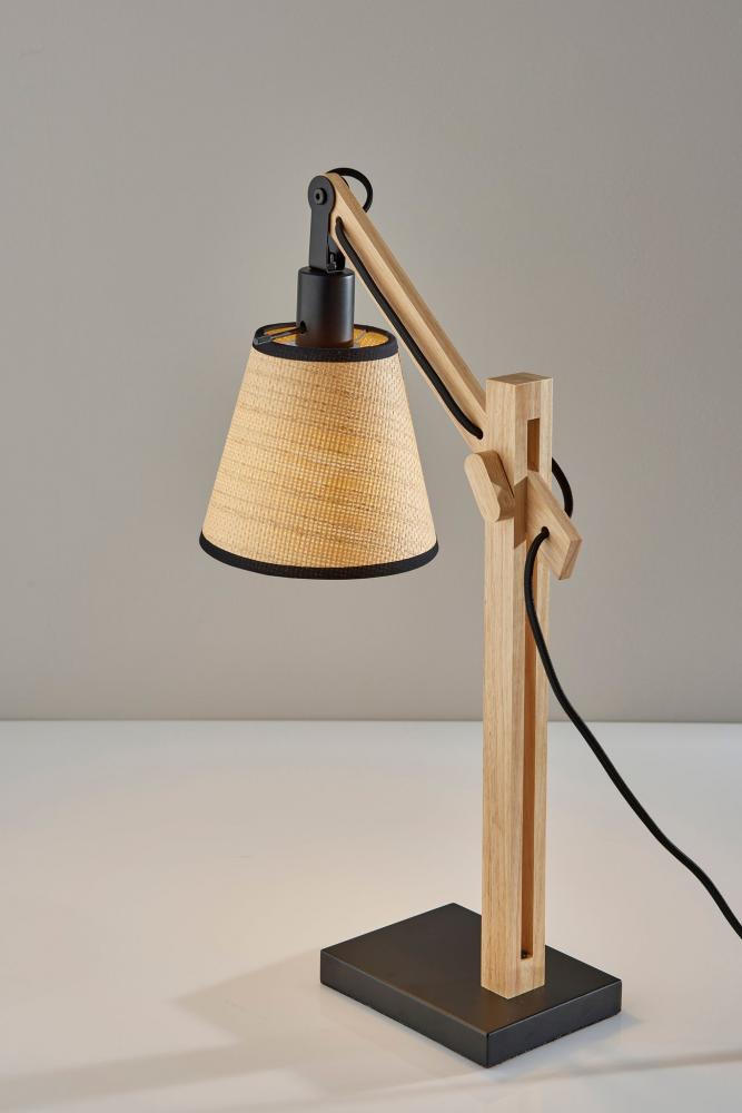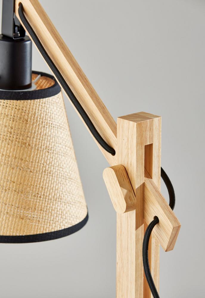 Introduce the Walden table lamp into rustic, contemporary, or eclectic spaces. Wooden joints adjust the balance arm to change the lamp height and angle of the shade, making the lamp ideal for both task lighting and ambient lighting. The black metal base and accents enhance an industrial style, while the natural wood body and natural woven paper shade with black trim along the top and bottom soften the look. For a unique style, the black fabric-covered cord threads through the square wood post body and drapes out the back, while the 60W bulb is easily turned on and off by a discreet rotary socket switch. The Walden table lamp is also available with a black wood construction for a monochrome look. Complete your décor with the coordinating Walden floor lamp.