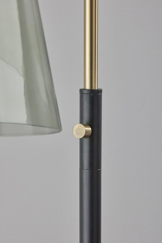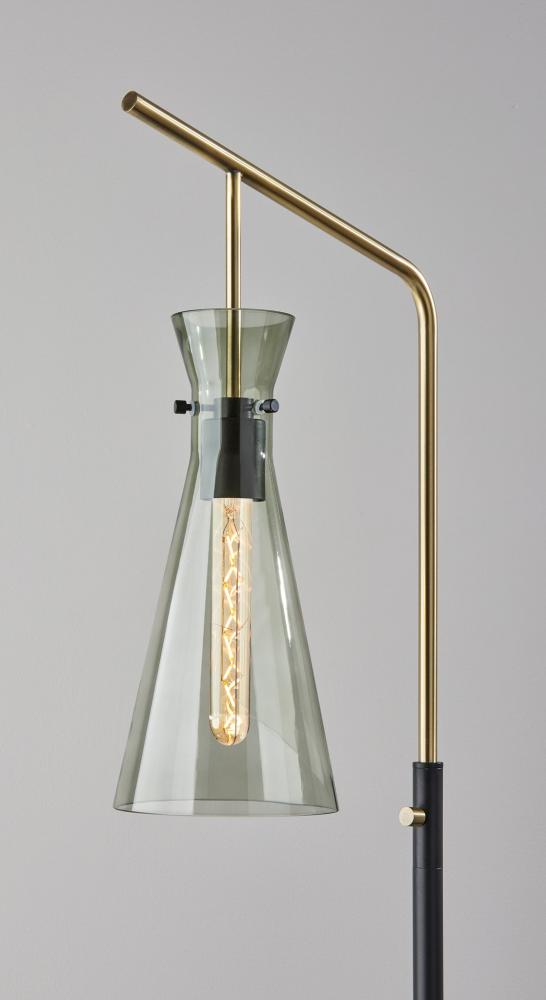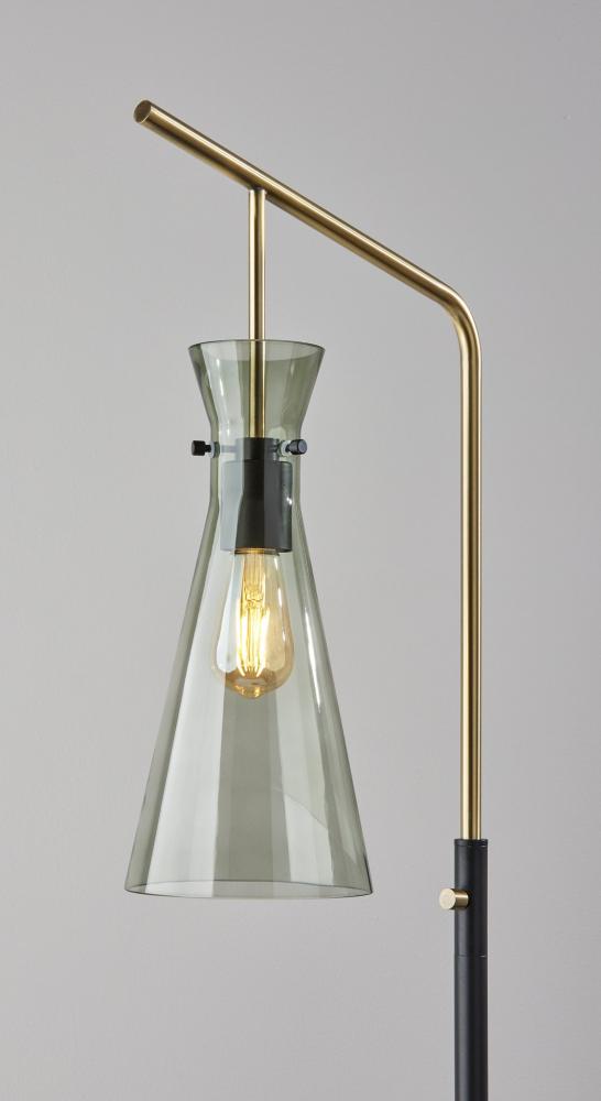 The Walker floor lamp embraces the mixed metal trend with its stunning and eye catching design. A round, black metal base supports a tall, slim black tube and antique brass arm. The arm is designed with a softened bend to support the elegant glass shade. Crafted of smoked glass, this tapered conical shade leaves the black metal socket and included 40W Edison tube bulb visible for striking, vintage appeal. The lamp is easily turned on or off with a rotary switch in antique brass finish located on the tube. Complete your décor with the coordinating Walker desk lamp, wall lamp, and pendant lighting.