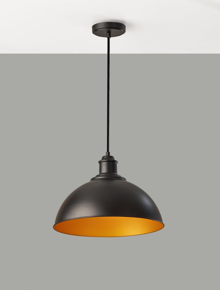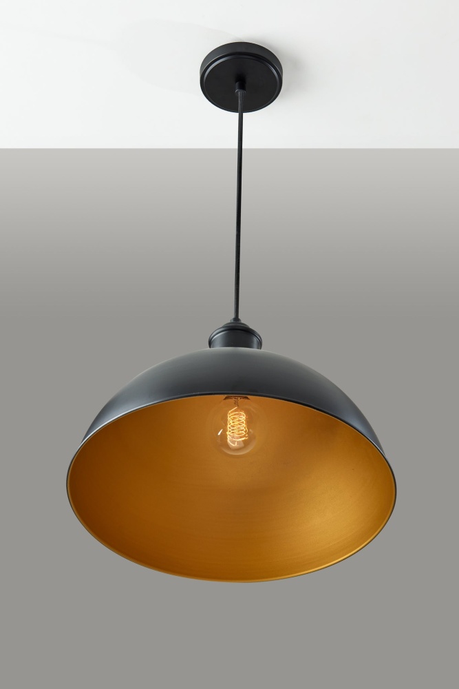 Add a touch of industrial style to your dining room, kitchen, or living room with the Wallace pendant light. It can be hung by itself or paired with several more to create a stunning effect and add illumination to your space. The large round black metal shade, measuring 16" in diameter and 7.5" tall, has a clean silhouette that leaves the bulb exposed, making a vintage Edison bulb (not included) an eye-catching choice. Complementing the exterior's black metal, the interior of the shade features an accent color of gold finish that imbues the light from a 150W bulb with a warm glow. This pendant light also features a round black metal base that is 5" in diameter. With a 6' black fabric-covered cord, the pendant height can be adjusted to suit the needs of any room regardless of the ceiling height. Complete your decor with the coordinating Wallace wall light, desk lamp, and floor lamp.